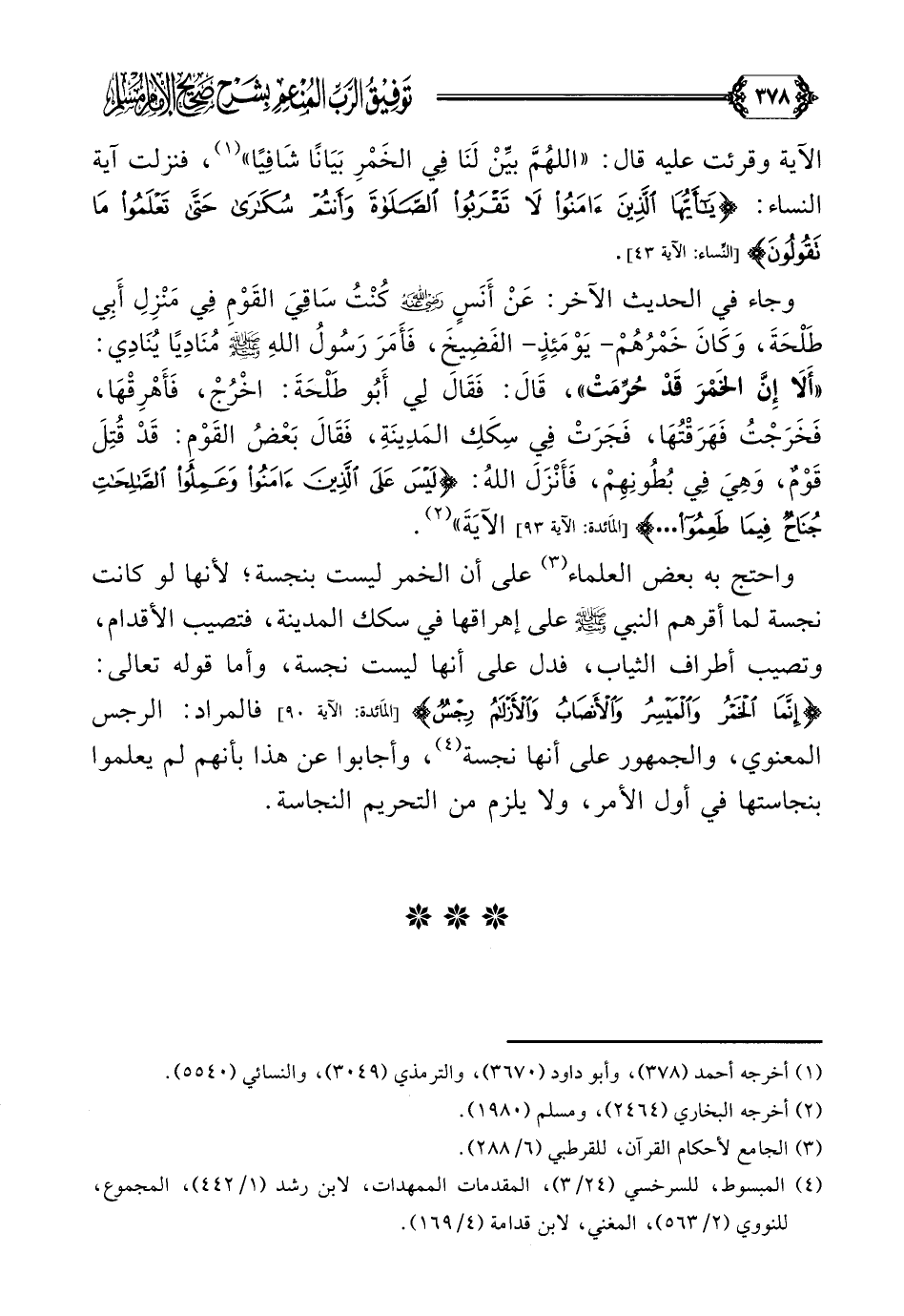 وجاء في الحديث الآخر: عَنْ أَنَسٍ رضي الله عنه كُنْتُ سَاقِيَ القَوْمِ فِي مَنْزِلِ أَبِي طَلْحَةَ، وَكَانَ خَمْرُهُمْ- يَوْمَئِذٍ- الفَضِيخَ، فَأَمَرَ رَسُولُ اللَّهِ صلى الله عليه وسلم مُنَادِيًا يُنَادِي: ((أَلا إِنَّ الخَمْرَ قَدْ حُرِّمَتْ))، قَالَ: فَقَالَ لِي أَبُو طَلْحَةَ: اخْرُجْ، فَأَهْرِقْهَا، فَخَرَجْتُ فَهَرَقْتُهَا، فَجَرَتْ فِي سِكَكِ المَدِينَةِ، فَقَالَ بَعْضُ القَوْمِ: قَدْ قُتِلَ قَوْمٌ، وَهِيَ فِي بُطُونِهِمْ، فَأَنْزَلَ اللَّهُ: {لَيْسَ عَلَى الَّذِينَ آمَنُوا وَعَمِلُوا الصَّالِحَاتِ جُنَاحٌ فِيمَا طَعِمُوا ... } الآيَةَ)) (¬٢).