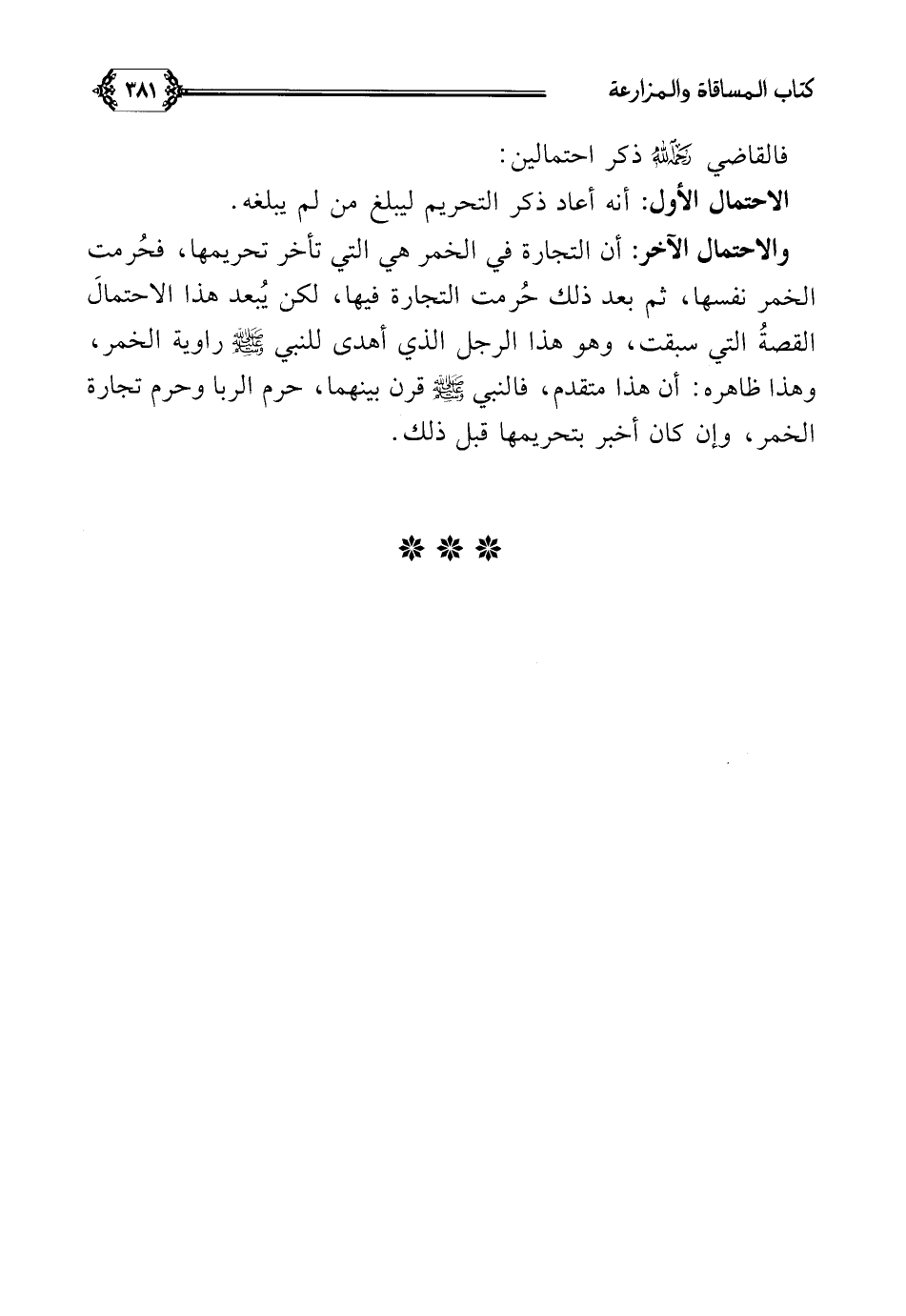 والاحتمال الآخر: أن التجارة في الخمر هي التي تأخر تحريمها، فحُرمت الخمر نفسها، ثم بعد ذلك حُرمت التجارة فيها، لكن يُبعد هذا الاحتمالَ القصةُ التي سبقت، وهو هذا الرجل الذي أهدى للنبي صلى الله عليه وسلم راوية الخمر، وهذا ظاهره: أن هذا متقدم، فالنبي صلى الله عليه وسلم قرن بينهما، حرم الربا وحرم تجارة الخمر، وإن كان أخبر بتحريمها قبل ذلك.