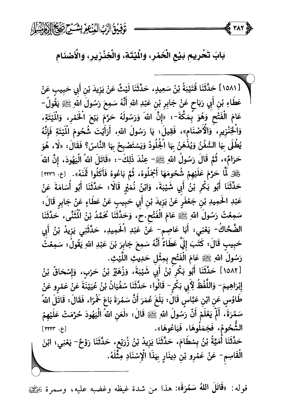 [١٥٨٢] حَدَّثَنَا أَبُو بَكْرِ بْنُ أَبِي شَيْبَةَ، وَزُهَيْرُ بْنُ حَرْبٍ، وَإِسْحَاقُ بْنُ إِبْرَاهِيمَ- وَاللَّفْظُ لِأَبِي بَكْرٍ- قَالُوا: حَدَّثَنَا سُفْيَانُ بْنُ عُيَيْنَةَ عَنْ عَمْرٍو عَنْ طَاوُسٍ عَنِ ابْنِ عَبَّاسٍ قَالَ: بَلَغَ عُمَرَ أَنَّ سَمُرَةَ بَاعَ خَمْرًا، فَقَالَ: قَاتَلَ اللَّهُ سَمُرَةَ، أَلَمْ يَعْلَمْ أَنّ رَسُولَ اللَّهِ صلى الله عليه وسلم قَالَ: ((لَعَنِ اللَّهُ الْيَهُودَ حُرِّمَتْ عَلَيْهِمُ الشُّحُومُ، فَجَمَلُوهَا، فَبَاعُوهَا)).