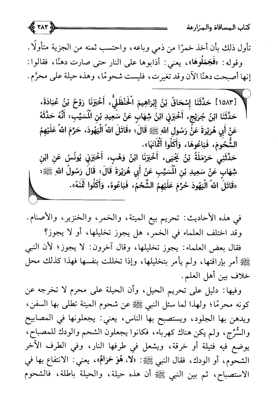 [١٥٨٣] حَدَّثَنَا إِسْحَاقُ بْنُ إِبْرَاهِيمَ الْحَنْظَلِيُّ، أَخْبَرَنَا رَوْحُ بْنُ عُبَادَةَ، حَدَّثَنَا ابْنُ جُرَيْجٍ، أَخْبَرَنِي ابْنُ شِهَابٍ عَنْ سَعِيدِ بْنِ الْمُسَيِّبِ: أَنَّهُ حَدَّثَهُ عَنْ أَبِي هُرَيْرَةَ عَنْ رَسُولِ اللَّهِ صلى الله عليه وسلم قَالَ: ((قَاتَلَ اللَّهُ الْيَهُودَ، حَرَّمَ اللَّهُ عَلَيْهِمُ الشُّحُومَ، فَبَاعُوهَا، وَأَكَلُوا أَثْمَانَهَا)).