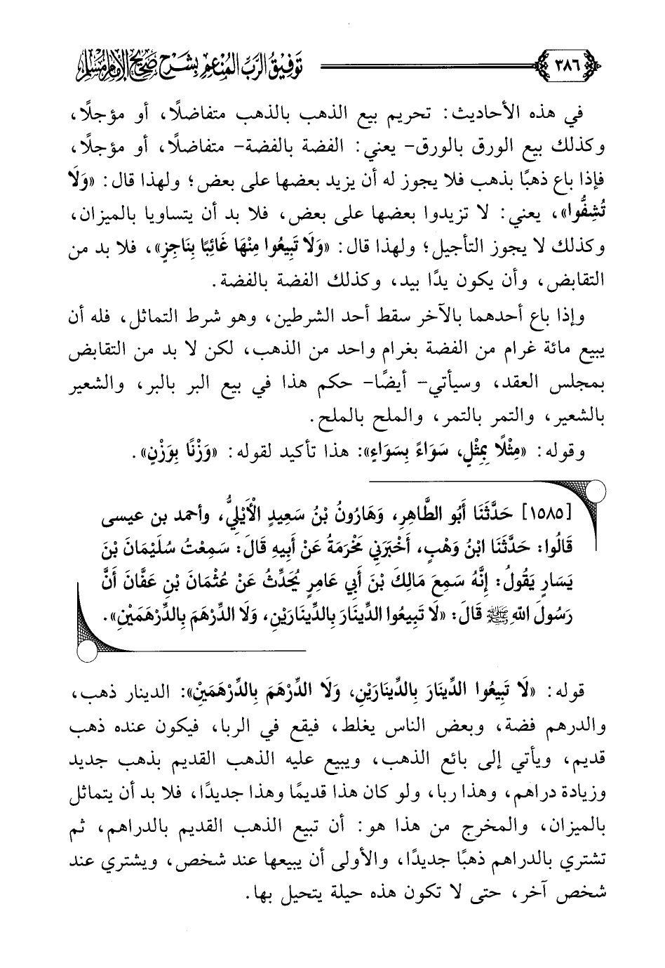 في هذه الأحاديث: تحريم بيع الذهب بالذهب متفاضلًا، أو مؤجلًا، وكذلك بيع الورق بالورق- يعني: الفضة بالفضة- متفاضلًا، أو مؤجلًا، فإذا باع ذهبًا بذهب فلا يجوز له أن يزيد بعضها على بعض؛ ولهذا قال: ((وَلَا تُشِفُّوا))، يعني: لا تزيدوا بعضها على بعض، فلا بد أن يتساويا بالميزان، وكذلك لا يجوز التأجيل؛ ولهذا قال: ((وَلَا تَبِيعُوا مِنْهَا غَائِبًا بِنَاجِزٍ))، فلا بد من التقابض، وأن يكون يدًا بيد، وكذلك الفضة بالفضة.