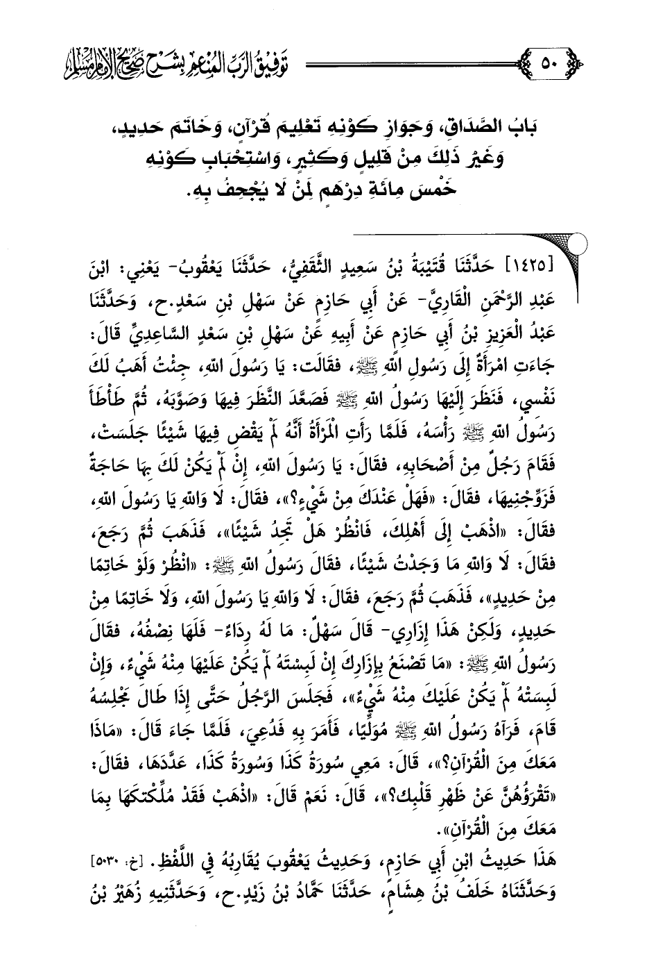 ح، وَحَدَّثَنَا عَبْدُ الْعَزِيزِ بْنُ أَبِي حَازِمٍ عَنْ أَبِيهِ عَنْ سَهْلِ بْنِ سَعْدٍ السَّاعِدِيِّ قَالَ: ((جَاءَتِ امْرَأَةٌ إِلَى رَسُولِ اللَّهِ صلى الله عليه وسلم، فقَالَت: يَا رَسُولَ اللَّهِ، جِئْتُ أَهَبُ لَكَ نَفْسِي، فَنَظَرَ إِلَيْهَا رَسُولُ اللَّهِ صلى الله عليه وسلم فَصَعَّدَ النَّظَرَ فِيهَا وَصَوَّبَهُ، ثُمَّ طَأْطَأَ رَسُولُ اللَّهِ صلى الله عليه وسلم رَأْسَهُ، فَلَمَّا رَأَتِ الْمَرْأَةُ أَنَّهُ لَمْ يَقْضِ فِيهَا شَيْئًا جَلَسَتْ، فَقَامَ رَجُلٌ مِنْ أَصْحَابِهِ، فقَالَ: يَا رَسُولَ اللَّهِ، إِنْ لَمْ يَكُنْ لَكَ بِهَا حَاجَةٌ فَزَوِّجْنِيهَا، فقَالَ: فَهَلْ عَنْدَكَ مِنْ شَيْءٍ؟ فقَالَ: لَا وَاللَّهِ يَا رَسُولَ اللَّهِ، فقَالَ: اذْهَبْ إِلَى أَهْلِكَ، فَانْظُرْ هَلْ تَجِدُ شَيْئًا، فَذَهَبَ ثُمَّ رَجَعَ، فقَالَ: لَا وَاللَّهِ مَا وَجَدْتُ شَيْئًا، فقَالَ رَسُولُ اللَّهِ صلى الله عليه وسلم: انْظُرْ وَلَوْ خَاتِمًا مِنْ حَدِيدٍ، فَذَهَبَ ثُمَّ رَجَعَ، فقَالَ: لَا وَاللَّهِ يَا رَسُولَ اللَّهِ، وَلَا خَاتِمًا مِنْ حَدِيدٍ، وَلَكِنْ هَذَا إِزَارِي- قَالَ سَهْلٌ: مَا لَهُ رِدَاءٌ- فَلَهَا نِصْفُهُ، فقَالَ رَسُولُ اللَّهِ صلى الله عليه وسلم: مَا تَصْنَعُ بِإِزَارِكَ إِنْ لَبِسْتَهُ لَمْ يَكُنْ عَلَيْهَا مِنْهُ شَيْءٌ، وَإِنْ لَبِسَتْهُ لَمْ يَكُنْ عَلَيْكَ مِنْهُ شَيْءٌ، فَجَلَسَ الرَّجُلُ حَتَّى إِذَا طَالَ مَجْلِسُهُ قَامَ، فَرَأَىهُ رَسُولُ اللَّهِ صلى الله عليه وسلم مُوَلِّيًا، فَأَمَرَ بِهِ فَدُعِيَ، فَلَمَّا جَاءَ قَالَ: مَاذَا مَعَكَ مِنَ الْقُرْآنِ؟ قَالَ: مَعِي سُورَةُ كَذَا وَسُورَةُ كَذَا، عَدَّدَهَا، فقَالَ: تَقْرَؤُهُنَّ عَنْ ظَهْرِ قَلْبِك؟ قَالَ: نَعَمْ قَالَ: اذْهَبْ فَقَدْ مُلِّكْتكَهَا بِمَا مَعَكَ مِنَ الْقُرْآنِ)).