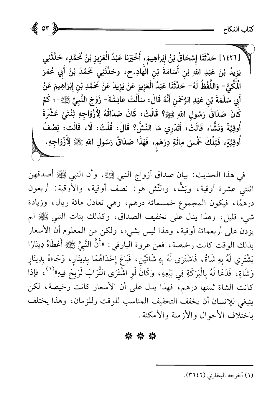 [١٤٢٦] حَدَّثَنَا إِسْحَاقُ بْنُ إِبْرَاهِيمَ، أَخْبَرَنا عَبْدُ الْعَزِيزِ بْنُ مُحَمَّدٍ، حَدَّثَنِي يَزِيدُ بْنُ عَبْدِ اللَّهِ بْنِ أُسَامَةَ بْنِ الْهَادِ. ح، وحَدَّثَنِي مُحَمَّدُ بْنُ أَبِي عُمَرَ الْمَكِّيُّ- وَاللَّفْظُ لَهُ- حَدَّثَنَا عَبْدُ الْعَزِيزِ عَنْ يَزِيدَ عَنْ مُحَمَّدِ بْنِ إِبْرَاهِيمَ عَنْ أَبِي سَلَمَةَ بْنِ عَبْدِ الرَّحْمَنِ أَنَّهُ قَالَ: ((سَأَلْتُ عَائِشَةَ- زَوْجَ النَّبِيِّ صلى الله عليه وسلم-: كَمْ كَانَ صَدَاقُ رَسُولِ اللَّهِ صلى الله عليه وسلم؟ قَالَتْ: كَانَ صَدَاقُهُ لِأَزْوَاجِهِ ثِنْتَيْ عَشْرَةَ أُوقِيَّةً وَنَشًّا، قَالَتْ: أَتَدْرِي مَا النَّشُّ؟ قَالَ: قُلْتُ: لَا، قَالَت: نِصْفُ أُوقِيَّةٍ، فَتِلْكَ خَمْسُ مِائَةِ دِرْهَمٍ، فَهَذَا صَدَاقُ رَسُولِ اللَّهِ صلى الله عليه وسلم لِأَزْوَاجِهِ)).