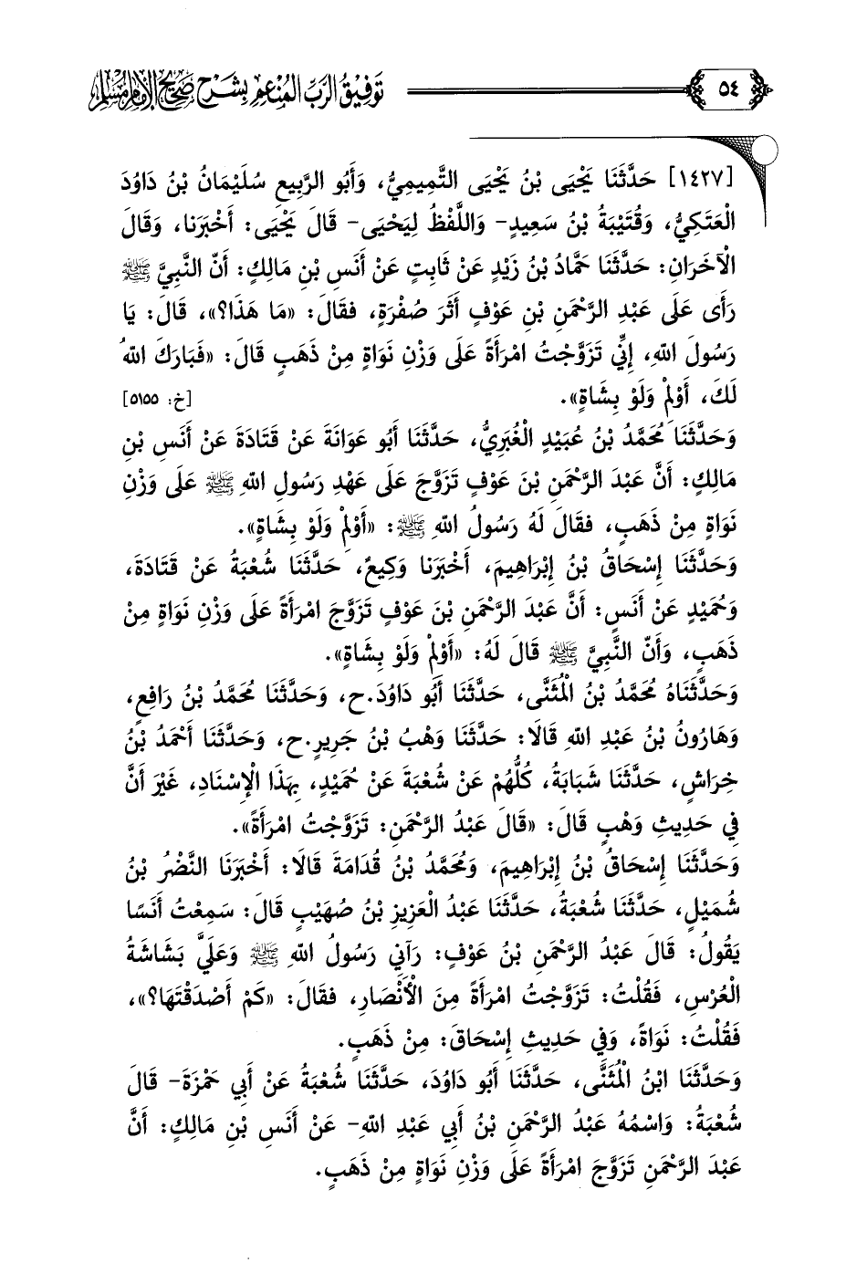 [١٤٢٧] حَدَّثَنَا يَحْيَى بْنُ يَحْيَى التَّمِيمِيُّ، وَأَبُو الرَّبِيعِ سُلَيْمَانُ بْنُ دَاوُدَ الْعَتَكِيُّ، وَقُتَيْبَةُ بْنُ سَعِيدٍ- وَاللَّفْظُ لِيَحْيَى- قَالَ يَحْيَى: أَخْبَرَنا، وَقَالَ الْآخَرَانِ: حَدَّثَنَا حَمَّادُ بْنُ زَيْدٍ عَنْ ثَابِتٍ عَنْ أَنَسِ بْنِ مَالِكٍ: ((أَنّ النَّبِيَّ صلى الله عليه وسلم رَأَى عَلَى عَبْدِ الرَّحْمَنِ بْنِ عَوْفٍ أَثَرَ صُفْرَةٍ، فقَالَ: مَا هَذَا؟ قَالَ: يَا رَسُولَ اللَّهِ، إِنِّي تَزَوَّجْتُ امْرَأَةً عَلَى وَزْنِ نَوَاةٍ مِنْ ذَهَبٍ قَالَ: فَبَارَكَ اللَّهُ لَكَ، أَوْلِمْ وَلَوْ بِشَاةٍ)).