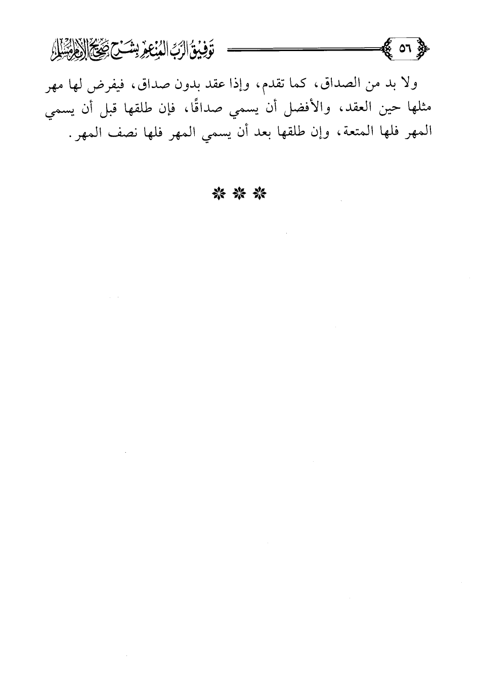 ولا بد من الصداق، كما تقدم، وإذا عقد بدون صداق، فيفرض لها مهر مثلها حين العقد، والأفضل أن يسمي صداقًا، فإن طلقها قبل أن يسمي المهر فلها المتعة، وإن طلقها بعد أن يسمي المهر فلها نصف المهر.