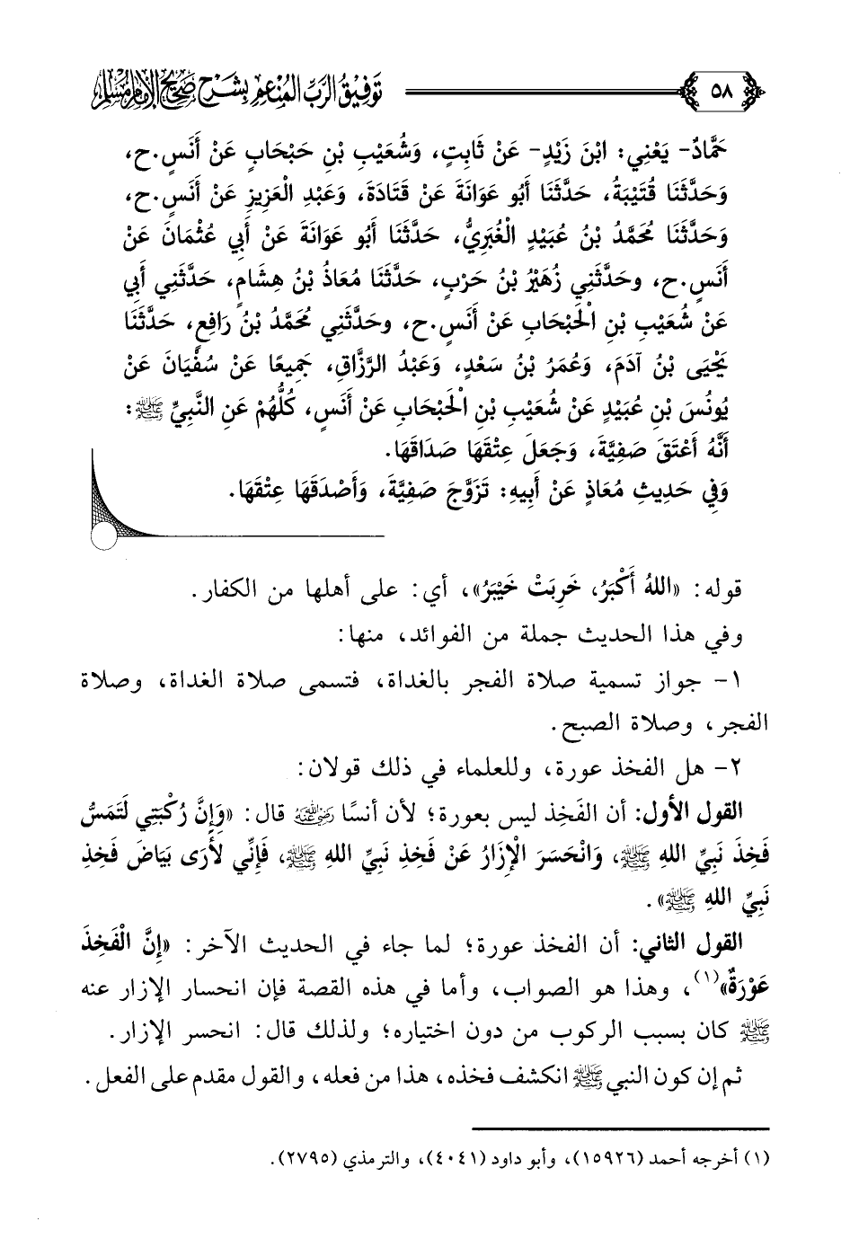 القول الثاني: أن الفخذ عورة؛ لما جاء في الحديث الآخر: ((إِنَّ الْفَخِذَ عَوْرَةٌ)) (¬١)، وهذا هو الصواب، وأما في هذه القصة فإن انحسار الإزار عنه عليه الصلاة والسلام كان بسبب الركوب من دون اختياره؛ ولذلك قال: انحسر الإزار.