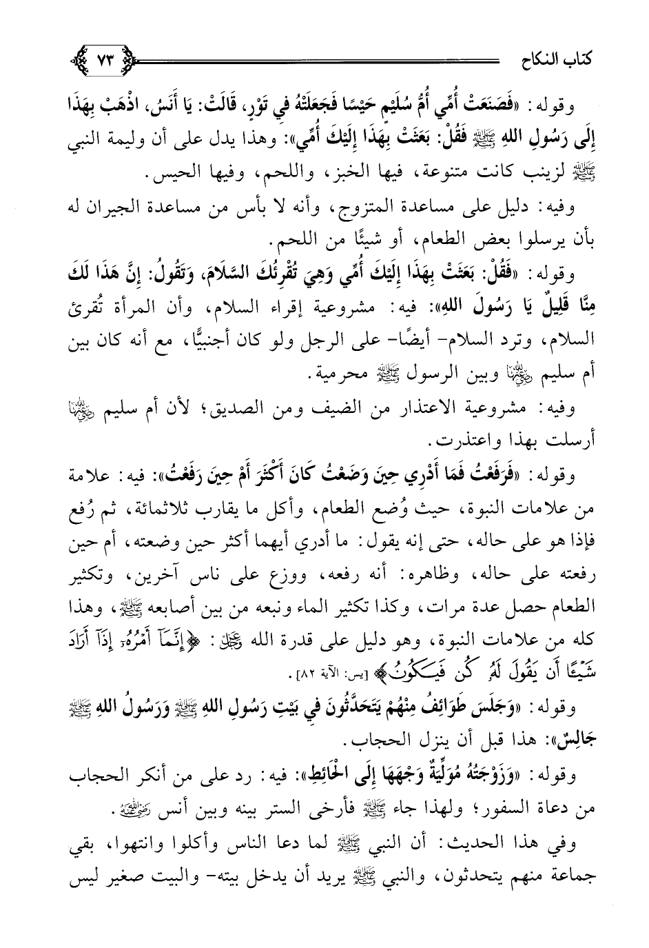وقوله: ((فَصَنَعَتْ أُمِّي أُمُّ سُلَيْمٍ حَيْسًا فَجَعَلَتْهُ فِي تَوْرٍ، قَالَتْ: يَا أَنَسُ، اذْهَبْ بِهَذَا إِلَى رَسُولِ اللَّهِ صلى الله عليه وسلم فَقُلْ: بَعَثَتْ بِهَذَا إِلَيْكَ أُمِّي)): وهذا يدل على أن وليمة النبي صلى الله عليه وسلم لزينب كانت متنوعة، فيها الخبز، واللحم، وفيها الحيس.