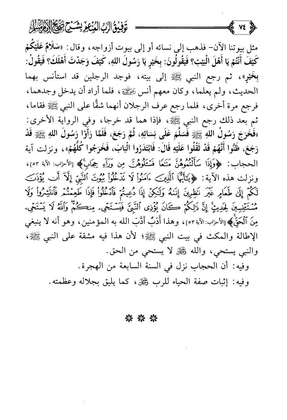 مثل بيوتنا الآن- فذهب إلى نسائه أو إلى بيوت أزواجه، وقال: ((سَلَامٌ عَلَيْكُمْ كَيْفَ أَنْتُمْ يَا أَهْلَ الْبَيْتِ؟ فَيَقُولُونَ: بِخَيْرٍ يَا رَسُولَ اللَّهِ، كَيْفَ وَجَدْتَ أَهْلَكَ؟ فَيَقُولُ: بِخَيْرٍ)) ثم رجع النبي صلى الله عليه وسلم إلى بيته، فوجد الرجلين قد استأنس بهما الحديث، ولم يعلما، وكان معهم أنس رضي الله عنه، فلما أراد أن يدخل وجدهما، فرجع مرة أخرى، فلما رجع عرف الرجلان أنهما شقَّا على النبي صلى الله عليه وسلم فقاما، ثم بعد ذلك رجع النبي صلى الله عليه وسلم، فإذا هما قد خرجا، وفي الرواية الأخرى: ((فَخَرَجَ رَسُولُ اللَّهِ صلى الله عليه وسلم فَسَلَّمَ عَلَى نِسَائِهِ، ثُمَّ رَجَعَ، فَلَمَّا رَأَوْا رَسُولَ اللَّهِ صلى الله عليه وسلم قَدْ رَجَعَ، ظَنُّوا أَنَّهُمْ قَدْ ثَقُلُوا عَلَيْهِ قَالَ: فَابْتَدَرُوا الْبَابَ، فَخَرَجُوا كُلُّهُمْ))، ونزلت آية الحجاب: {وإذا سألتموهن متاعًا فسألوهن من وراء حجاب}، ونزلت هذه الآية: {يَاأَيُّهَا الَّذِينَ آمَنُوا لَا تَدْخُلُوا بُيُوتَ النَّبِيِّ إِلَّا أَنْ يُؤْذَنَ لَكُمْ إِلَى طَعَامٍ غَيْرَ نَاظِرِينَ إِنَاهُ وَلَكِنْ إِذَا دُعِيتُمْ فَادْخُلُوا فَإِذَا طَعِمْتُمْ فَانْتَشِرُوا وَلَا مُسْتَأْنِسِينَ لِحَدِيثٍ إِنَّ ذَلِكُمْ كَانَ يُؤْذِي النَّبِيَّ فَيَسْتَحْيِي مِنْكُمْ وَاللَّهُ لَا يَسْتَحْيِي مِنَ الْحَقِّ}، وهذا أَدَبٌ أدَّبَ الله به المؤمنين، وهو أنه لا ينبغي الإطالة والمكث في بيت النبي صلى الله عليه وسلم؛ لأن هذا فيه مشقة على النبي صلى الله عليه وسلم، والنبي يستحي، والله عز وجل لا يستحي من الحق.