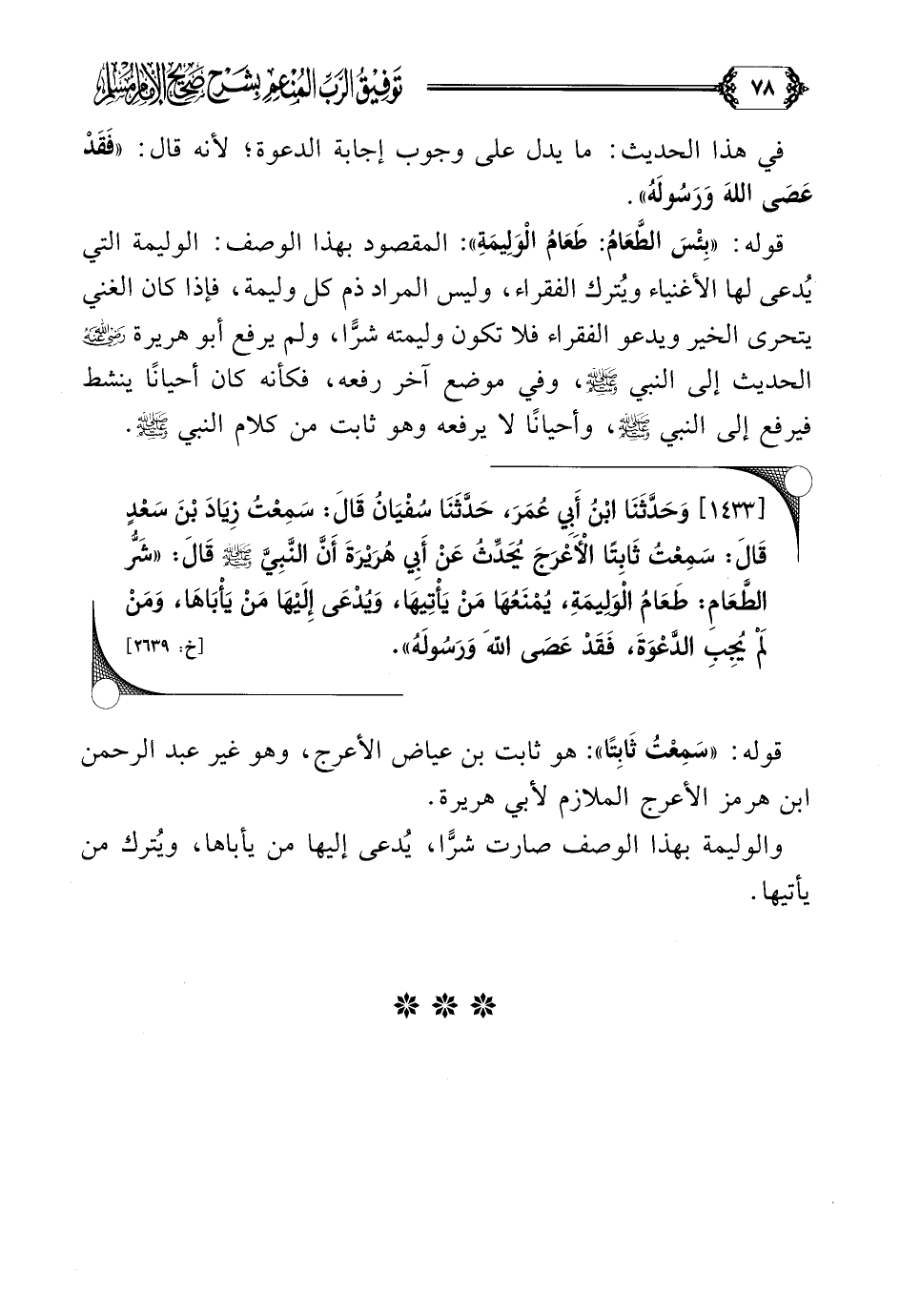 [١٤٣٣] وَحَدَّثَنَا ابْنُ أَبِي عُمَرَ، حَدَّثَنَا سُفْيَانُ قَالَ: سَمِعْتُ زِيَادَ بْنَ سَعْدٍ قَالَ: سَمِعْتُ ثَابِتًا الْأَعْرَجَ يُحَدِّثُ عَنْ أَبِي هُرَيْرَةَ أَنَّ النَّبِيَّ صلى الله عليه وسلم قَالَ: ((شَرُّ الطَّعَامِ: طَعَامُ الْوَلِيمَةِ، يُمْنَعُهَا مَنْ يَأْتِيهَا، وَيُدْعَى إِلَيْهَا مَنْ يَأْبَاهَا، وَمَنْ لَمْ يُجِبِ الدَّعْوَةَ، فَقَدْ عَصَى اللَّهَ وَرَسُولَهُ)).