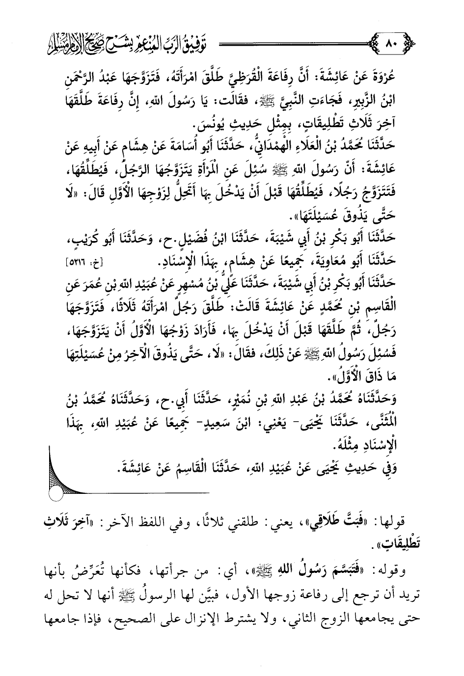 حَدَّثَنَا مُحَمَّدُ بْنُ الْعَلَاءِ الْهَمْدَانِيُّ، حَدَّثَنَا أَبُو أُسَامَةَ عَنْ هِشَامٍ عَنْ أَبِيهِ عَنْ عَائِشَةَ: ((أَنّ رَسُولَ اللَّهِ صلى الله عليه وسلم سُئِلَ عَنِ الْمَرْأَةِ يَتَزَوَّجُهَا الرَّجُلُ، فَيُطَلِّقُهَا، فَتَتَزَوَّجُ رَجُلًا، فَيُطَلِّقُهَا قَبْلَ أَنْ يَدْخُلَ بِهَا أَتَحِلُّ لِزَوْجِهَا الْأَوَّلِ قَالَ: لَا حَتَّى يَذُوقَ عُسَيْلَتَهَا)).