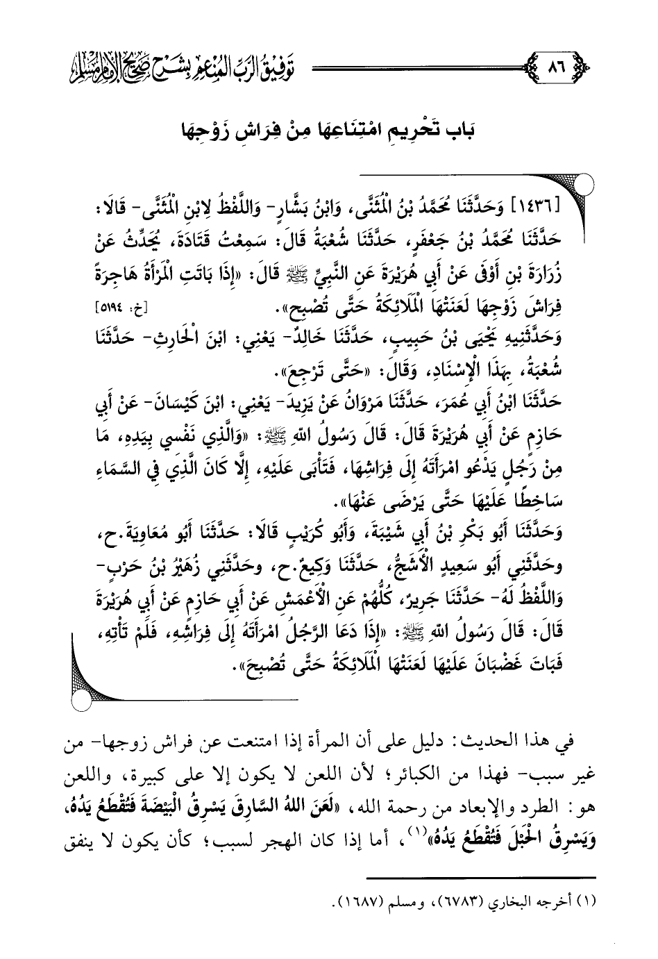 [١٤٣٦] وَحَدَّثَنَا مُحَمَّدُ بْنُ الْمُثَنَّى، وَابْنُ بَشَّارٍ- وَاللَّفْظُ لِابْنِ الْمُثَنَّى- قَالَا: حَدَّثَنَا مُحَمَّدُ بْنُ جَعْفَرٍ، حَدَّثَنَا شُعْبَةُ قَالَ: سَمِعْتُ قَتَادَةَ، يُحَدِّثُ عَنْ زُرَارَةَ بْنِ أَوْفَى عَنْ أَبِي هُرَيْرَةَ عَنِ النَّبِيِّ صلى الله عليه وسلم قَالَ: ((إِذَا بَاتَتِ الْمَرْأَةُ هَاجِرَةً فِرَاشَ زَوْجِهَا لَعَنَتْهَا الْمَلَائِكَةُ حَتَّى تُصْبِح)).