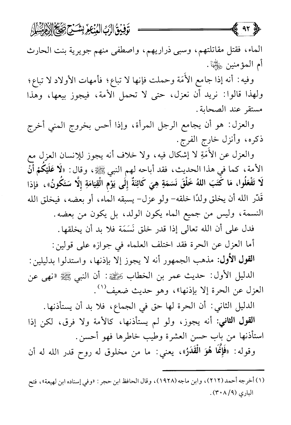 والعزل عن الأَمَةِ لا إشكال فيه، ولا خلاف أنه يجوز للإنسان العزل عن الأمة، كما في هذا الحديث، فقد أباحه لهم النبي صلى الله عليه وسلم، وقال: ((لَا عَلَيْكُمْ أَنْ لَا تَفْعَلُوا، مَا كَتَبَ اللَّهُ خَلْقَ نَسَمَةٍ هِيَ كَائِنَةٌ إِلَى يَوْمِ الْقِيَامَةِ إِلَّا سَتَكُونُ))، فإذا قَدّر الله أن يخلق ولدًا خَلقَه- ولو عزل- يسبقه الماء، أو بعضه، فيخلق الله النسمة، وليس من جميع الماء يكون الولد، بل يكون من بعضه.