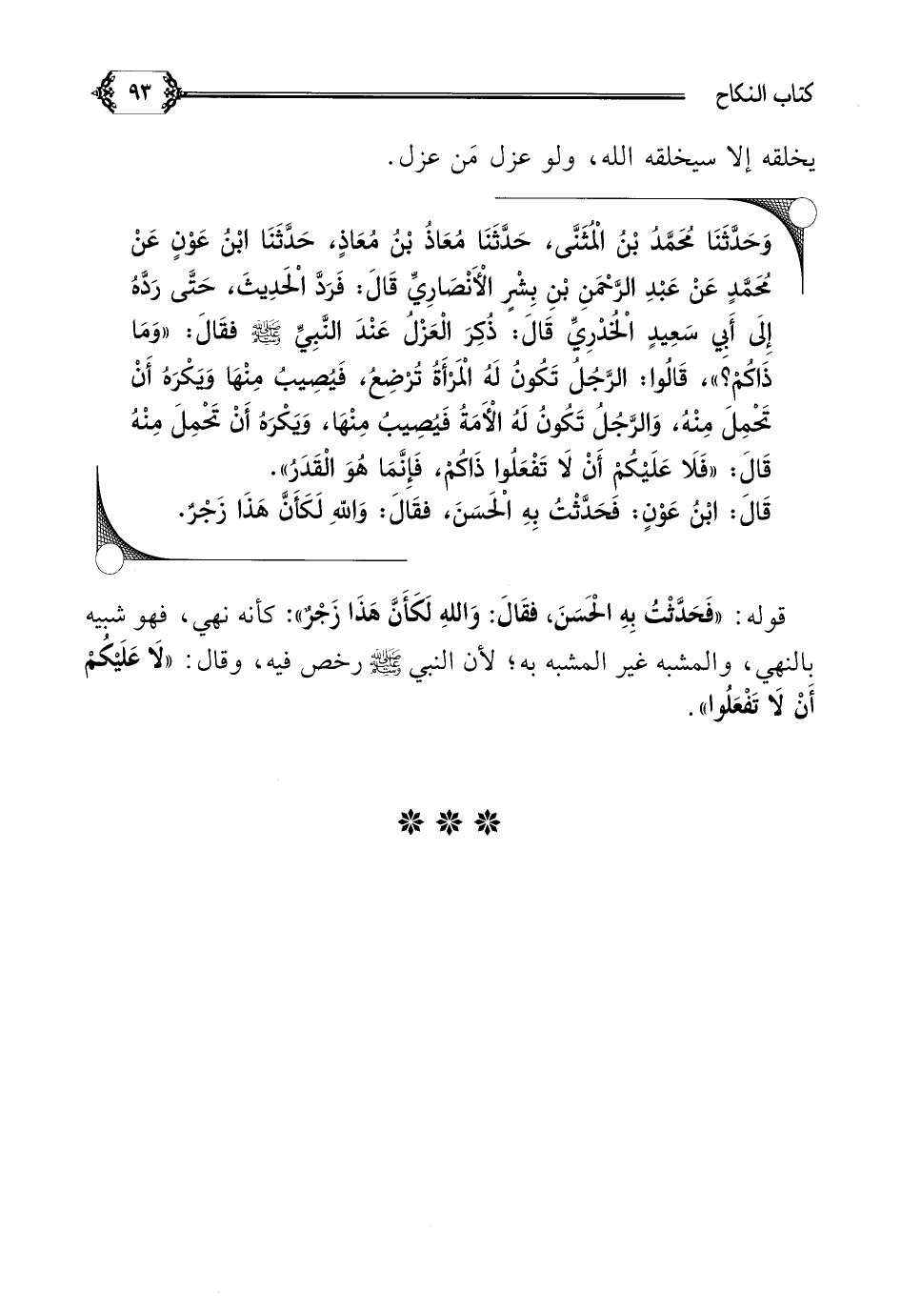 وَحَدَّثَنَا مُحَمَّدُ بْنُ الْمُثَنَّى، حَدَّثَنَا مُعَاذُ بْنُ مُعَاذٍ، حَدَّثَنَا ابْنُ عَوْنٍ عَنْ مُحَمَّدٍ عَنْ عَبْدِ الرَّحْمَنِ بْنِ بِشْرٍ الْأَنْصَارِيِّ قَالَ: فَرَدَّ الْحَدِيثَ، حَتَّى رَدَّهُ إِلَى أَبِي سَعِيدٍ الْخُدْرِيِّ قَالَ: ((ذُكِرَ الْعَزْلُ عَنْدَ النَّبِيِّ صلى الله عليه وسلم فقَالَ: وَمَا ذَاكُمْ؟ قَالُوا: الرَّجُلُ تَكُونُ لَهُ الْمَرْأَةُ تُرْضِعُ، فَيُصِيبُ مِنْهَا وَيَكْرَهُ أَنْ تَحْمِلَ مِنْهُ، وَالرَّجُلُ تَكُونُ لَهُ الْأَمَةُ فَيُصِيبُ مِنْهَا، وَيَكْرَهُ أَنْ تَحْمِلَ مِنْهُ قَالَ: ((فَلَا عَلَيْكُمْ أَنْ لَا تَفْعَلُوا ذَاكُمْ، فَإِنَّمَا هُوَ الْقَدَرُ)).