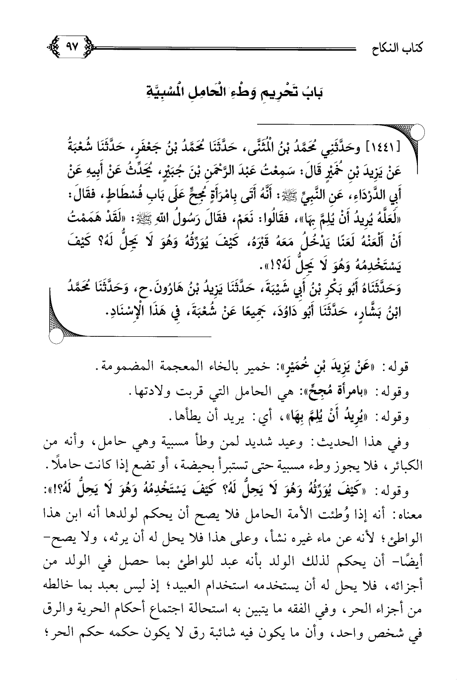 [١٤٤١] وحَدَّثَنِي مُحَمَّدُ بْنُ الْمُثَنَّى، حَدَّثَنَا مُحَمَّدُ بْنُ جَعْفَرٍ، حَدَّثَنَا شُعْبَةُ عَنْ يَزِيدَ بْنِ خُمَيْرٍ قَالَ: سَمِعْتُ عَبْدَ الرَّحْمَنِ بْنَ جُبَيْرٍ، يُحَدِّثُ عَنْ أَبِيهِ عَنْ أَبِي الدَّرْدَاءِ، عَنِ النَّبِيِّ صلى الله عليه وسلم: ((أَنَّهُ أَتَى بِامْرَأَةٍ مُجِحٍّ عَلَى بَابِ فُسْطَاطٍ، فقَالَ: لَعَلَّهُ يُرِيدُ أَنْ يُلِمَّ بِهَا، فقَالُوا: نَعَمْ، فقَالَ رَسُولُ اللَّهِ صلى الله عليه وسلم: لَقَدْ هَمَمْتُ أَنْ أَلْعَنْهُ لَعَنًا يَدْخُلُ مَعَهُ قَبْرَهُ، كَيْفَ يُوَرِّثُهُ وَهُوَ لَا يَحِلُّ لَهُ؟ كَيْفَ يَسْتَخْدِمُهُ وَهُوَ لَا يَحِلُّ لَهُ؟ ! )).