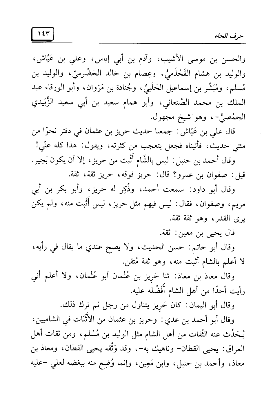 وقال أحمد بن حنبل: ليس بالشَّام أَثْبت من حريز، إلا أن يكون بَجِير. قيل: صفوان بن عمرو؟ قال: حريز فوقه، حريز ثقة، ثقة.