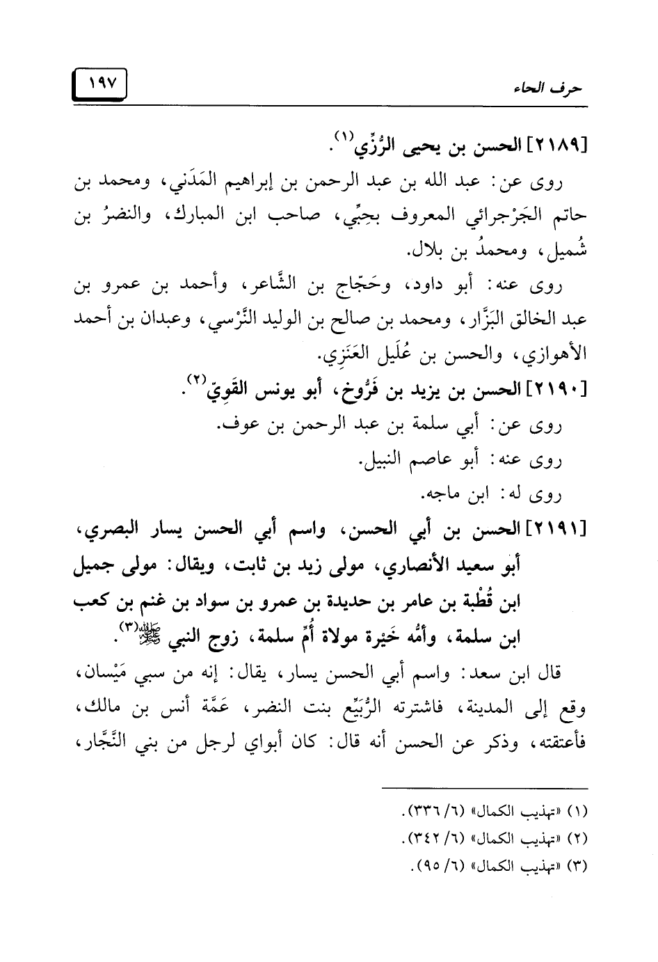 [٢١٩١] الحسن بن أبي الحسن، واسم أبي الحسن يسار البصري، أبو سعيد الأنصاري، مولي زيد بن ثابت، ويقال: مولي جميل ابن قُطْبة بن عامر بن حديدة بن عمرو بن سواد بن غنم بن كعب ابن سلمة، وأمُّه خَيْرة مولاة أُمِّ سلمة، زوج النبي -صَلَّى اللهُ عَلَيْهِ وَسَلَّمَ- (¬٣).