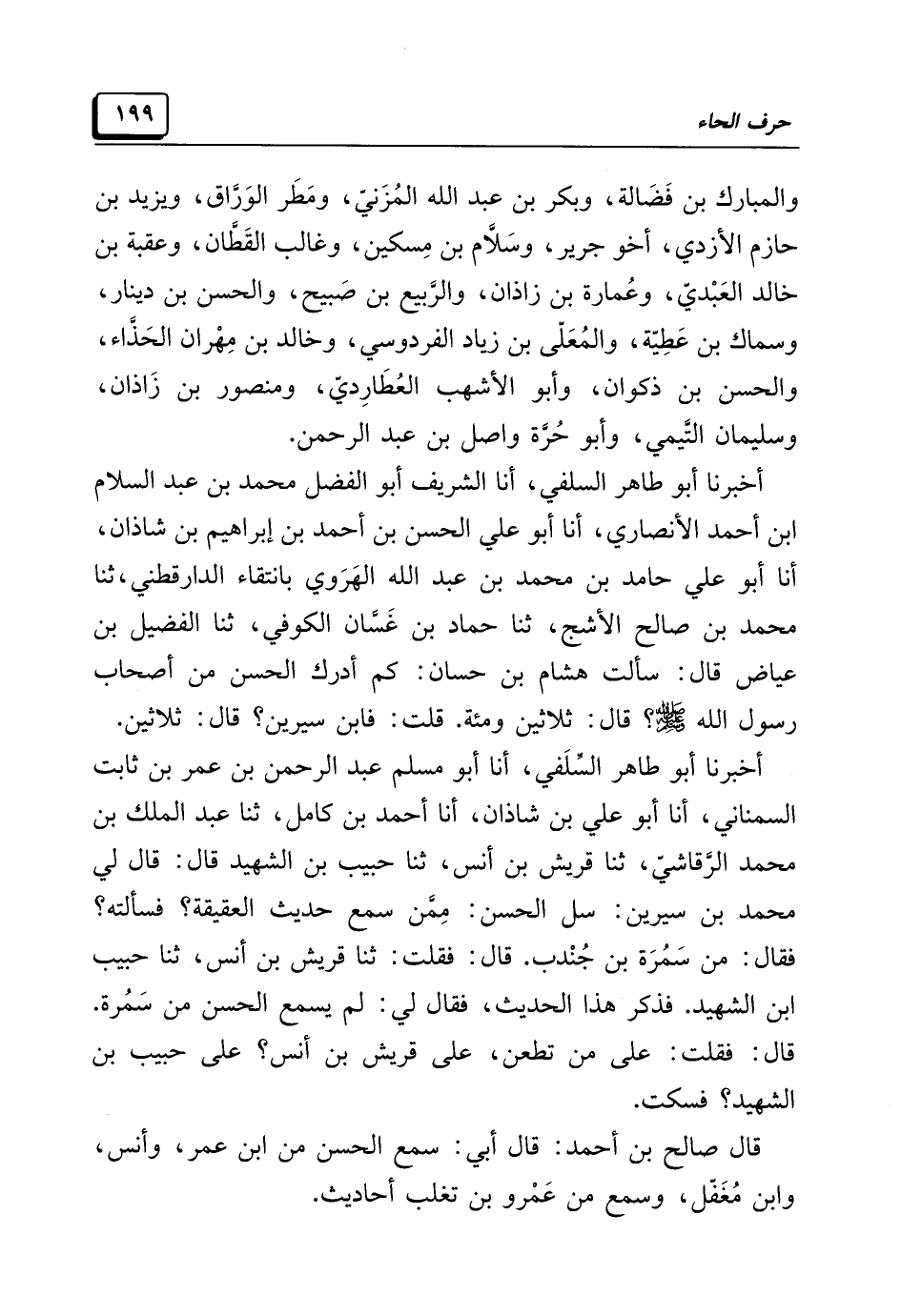 أخبرنا أبو طاهر السلفي، أنا الشريف أبو الفضل محمد بن عبد السلام ابن أحمد الأنصاري، أنا أبو علي الحسن بن أحمد بن إبراهيم بن شاذان، أنا أبو علي حامد بن محمد بن عبد الله الهَرَوي بانتقاء الدارقطني، ثنا محمد بن صالح الأشج، ثنا حماد بن غَسَّان الكوفي، ثنا الفضيل بن عياض قال: سألت هشام بن حسان: كم أدرك الحسن من أصحاب رسول الله -صَلَّى اللهُ عَلَيْهِ وَسَلَّمَ-؟ قال: ثلاثين ومئة. قلت: فابن سيرين؟ قال: ثلاثين.