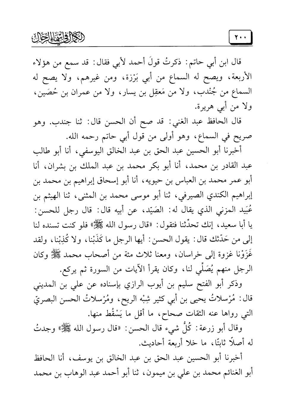 أخبرنا أبو الحسين عبد الحق بن عبد الخالق اليوسفي، أنا أبو طالب عبد القادر بن محمد، أنا أبو بكر محمد بن عبد الملك بن بشران، أنا أبو عمر محمد بن العباس بن حيويه، أنا أبو إسحاق إبراهيم بن محمد بن إبراهيم الكندي الصيرفي، ثنا أبو موسى محمد بن المثنى، ثنا الهيثم بن عُبَيد المزني الذي يقال له: الصّيد، عن أبيه قال: قال رجل للحسن: يا أبا سعيد، إنك تحدِّثنا فتقول: "قال رسول الله -صَلَّى اللهُ عَلَيْهِ وَسَلَّمَ-" فلو كنت تسنده لنا إلى من حَدّثك قال: يقول الحسن: أيها الرجل ما كَذَبْنا، ولا كُذِبْنا، ولقد غَزَوْنا غزوة إلى خراسان، ومعنا ثلاث مئة من أصحاب محمد -صَلَّى اللهُ عَلَيْهِ وَسَلَّمَ- وكان الرجل منهم يُصَلِّي لنا، وكان يقرأ الآيات من السورة ثم يركع.