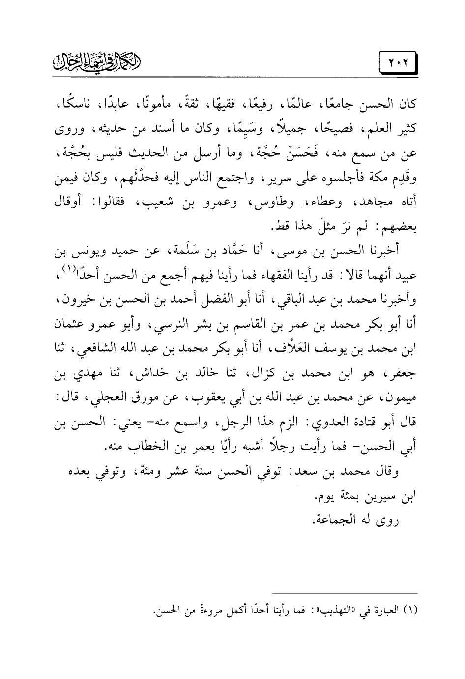 (¬١) العبارة في "التهذيب": فما رأينا أحدًا أكمل مروءةً من الحسن.