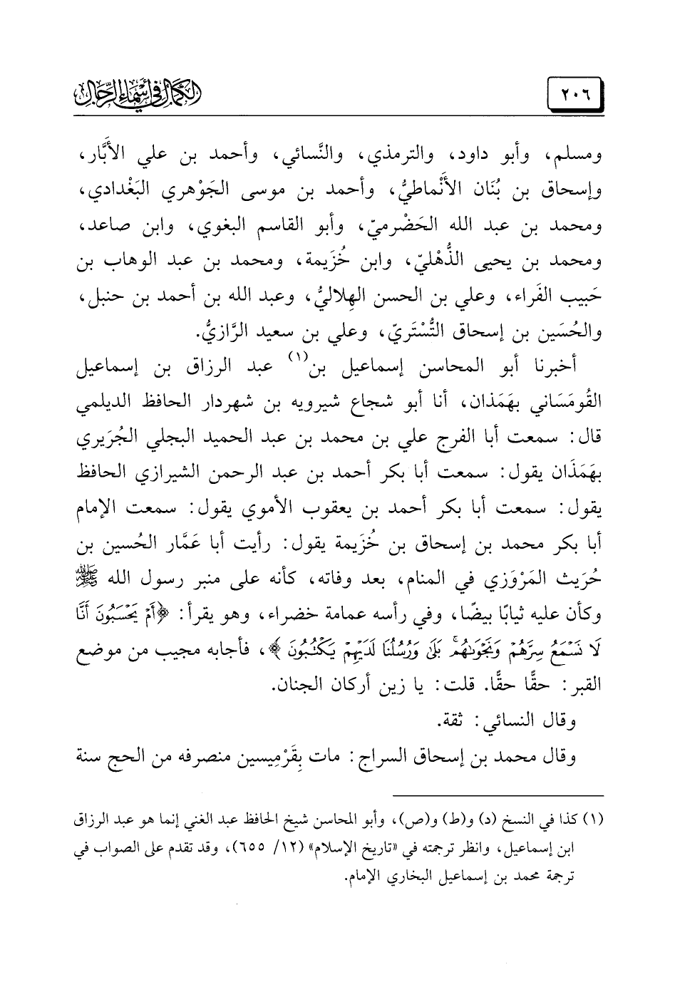 (¬١) كذا في النسخ (د) و (ط) و (ص)، وأبو المحاسن شيخ الحافظ عبد الغني إنما هو عبد الرزاق ابن إسماعيل، وانظر ترجمته في "تاريخ الإسلام" (١٢/ ٦٥٥)، وقد تقدم على الصواب في ترجمة محمد بن إسماعيل البخاري الإمام.
