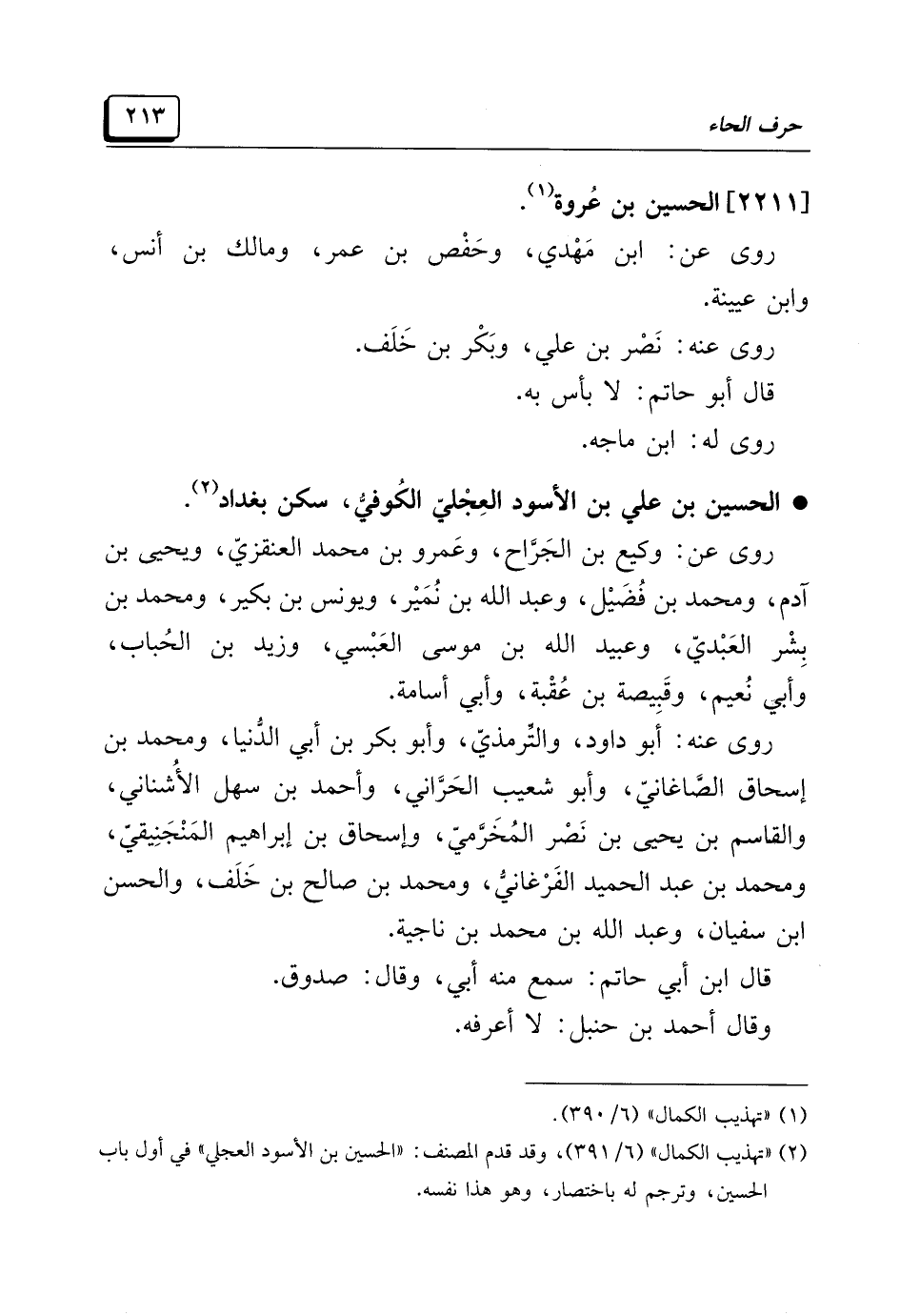(¬٢) "تهذيب الكمال" (٦/ ٣٩١)، وقد قدم المصنف: "الحسين بن الأسود العجلي" في أول باب الحسين، وترجم له باختصار، وهو هذا نفسه.