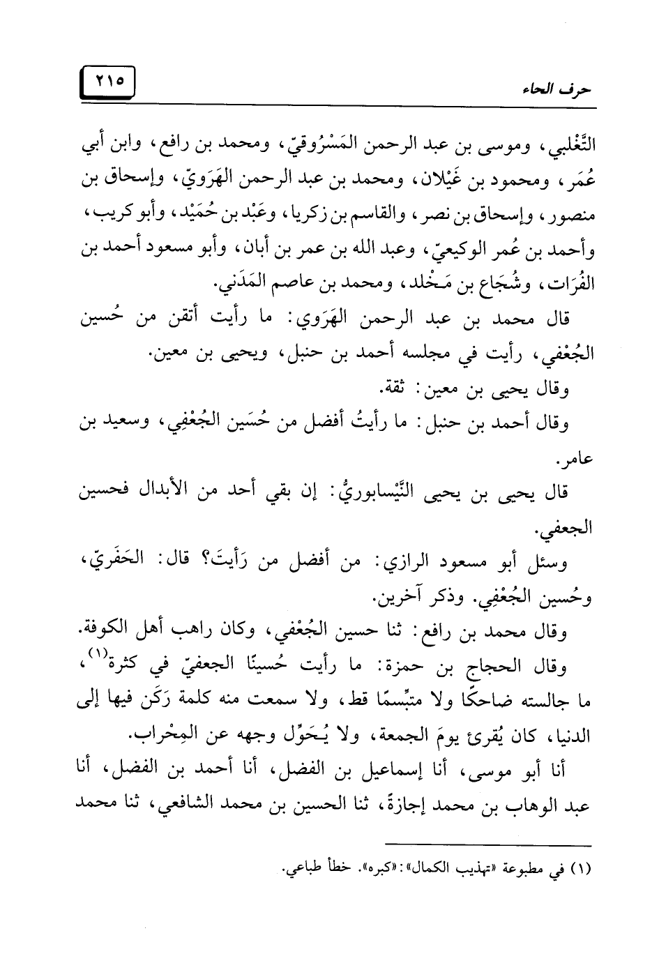 قال محمد بن عبد الرحمن الهَرَوي: ما رأيت أتقن من حُسين الجُعْفي، رأيت في مجلسه أحمد بن حنبل، ويحيى بن معين.