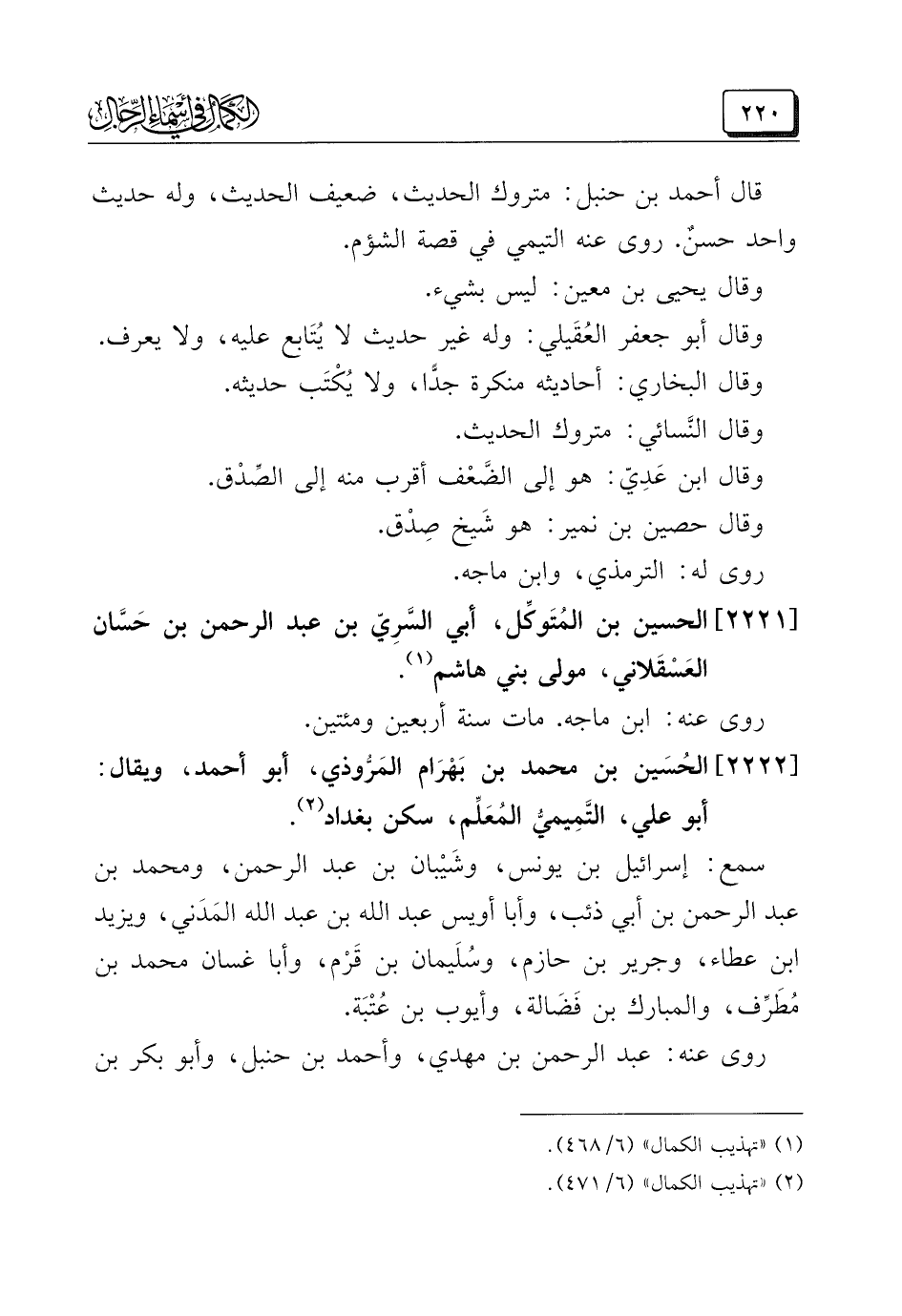 [٢٢٢١] الحسين بن المُتَوكِّل، أبي السَّرِيّ بن عبد الرحمن بن حَسَّان العَسْقَلاني، مولى بني هاشم (¬١).