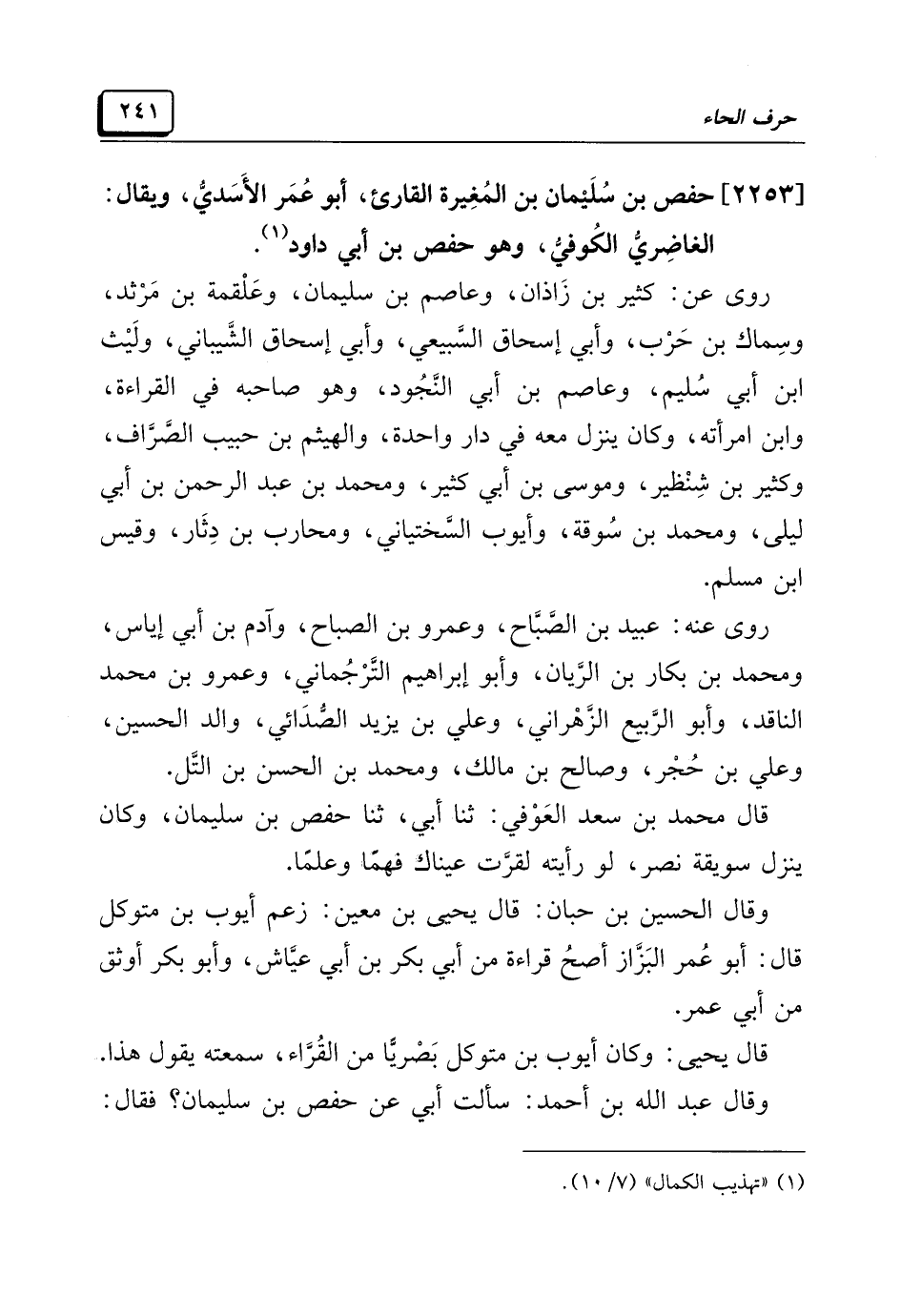 [٢٢٥٣] حفص بن سُلَيْمان بن المُغِيرة القارئ، أبو عُمَر الأَسَديُّ، ويقال: الغاضِريُّ الكُوفيُّ، وهو حفص بن أبي داود (¬١).