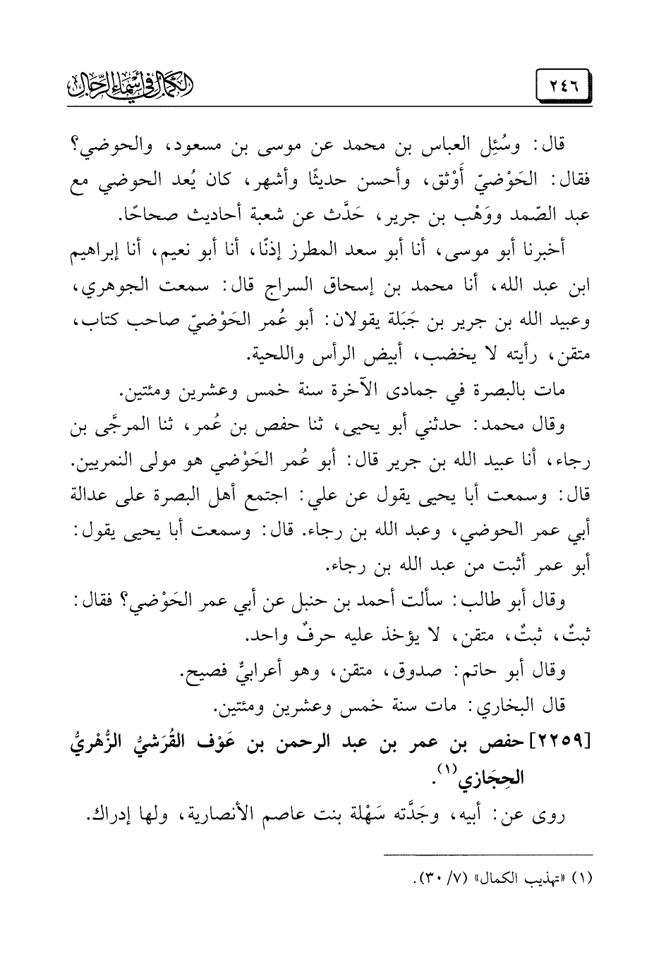 أخبرنا أبو موسى، أنا أبو سعد المطرز إذنا، أنا أبو نعيم، أنا إبراهيم ابن عبد الله، أنا محمد بن إسحاق السراج قال: سمعت الجوهري، وعبيد الله بن جرير بن جَبَلة يقولان: أبو عُمر الحَوْضيّ صاحب كتاب، متقن، رأيته لا يخضب، أبيض الرأس واللحية.
