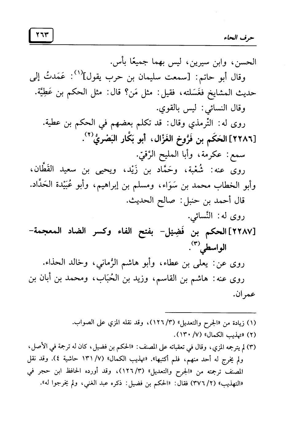 (¬٣) لم يترجمه المزي، وقال في تعقباته على المصنف: "الحكم بن فضيل، كان له ترجمة في الأصل، ولم يخرج له أحد منهم، فلم أكتبها". "تهذيب الكمال" (٧/ ١٣١ حاشية ٤). وقد نقل المصنف ترجمته من "الجرح والتعديل" (٣/ ١٢٦)، وقد أورده الحافظ ابن حجر في "التهذيب" (٢/ ٣٧٦) فقال: "الحكم بن فضيل: ذكره عبد الغني، ولم يخرجوا له".