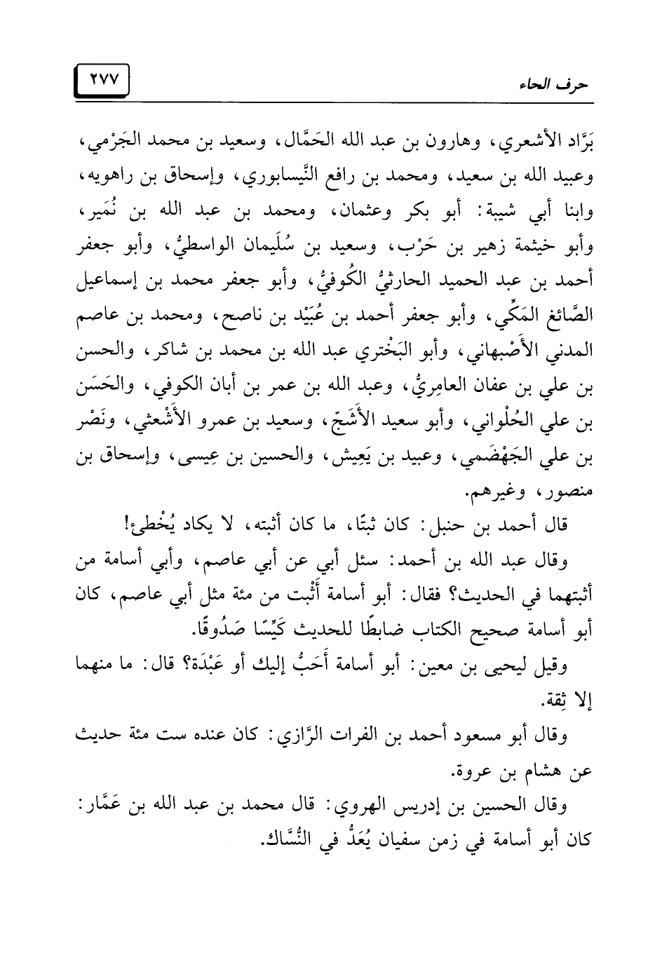 وقال عبد الله بن أحمد: سئل أبي عن أبي عاصم، وأبي أسامة من أثبتهما في الحديث؟ فقال: أبو أسامة أَثْبت من مئة مثل أبي عاصم، كان أبو أسامة صحيح الكتاب ضابطًا للحديث كَيِّسًا صَدُوقًا.