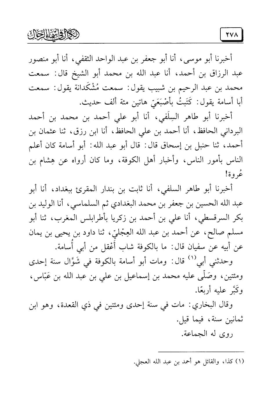 أخبرنا أبو طاهر السِّلَفي، أنا أبو علي أحمد بن محمد بن أحمد البرداني الحافظ، أنا أحمد بن علي الحافظ، أنا ابن رزق، ثنا عثمان بن أحمد، ثنا حنبل بن إسحاق قال: قال أبو عبد الله: أبو أسامة كان أعلم الناس بأمور الناس، وأخبار أهل الكوفة، وما كان أرواه عن هِشام بن عُروة!