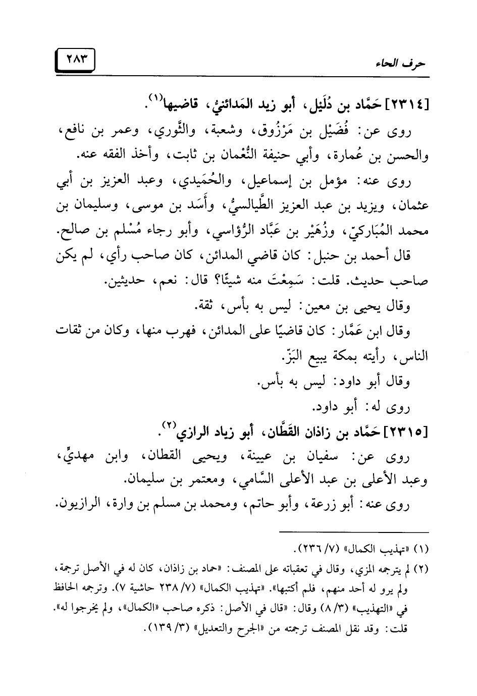 (¬٢) لم يترجمه المزي، وقال في تعقباته على المصنف: "حماد بن زاذان، كان له في الأصل ترجمة، ولم يرو له أحد منهم، فلم أكتبها". "تهذيب الكمال" (٧/ ٢٣٨ حاشية ٧). وترجمه الحافظ في "التهذيب" (٣/ ٨) وقال: "قال في الأصل: ذكره صاحب "الكمال"، ولم يخرجوا له". قلت: وقد نقل المصنف ترجمته من "الجرح والتعديل" (٣/ ١٣٩).