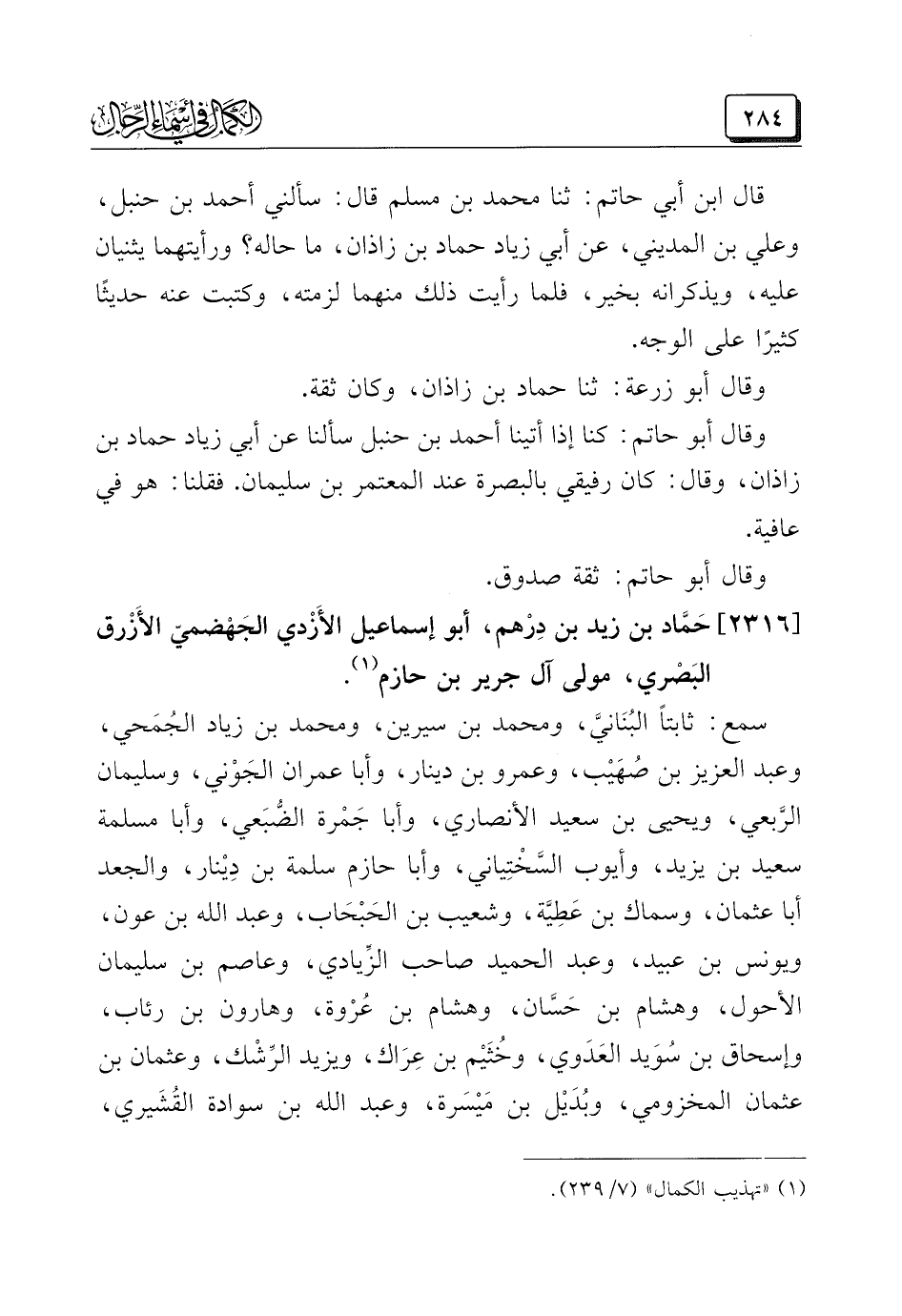 [٢٣١٦] حَمَّاد بن زيد بن دِرْهم، أبو إسماعيل الأَزْدي الجَهْضميّ الأَزْرق البَصْري، مولى آل جرير بن حازم (¬١).