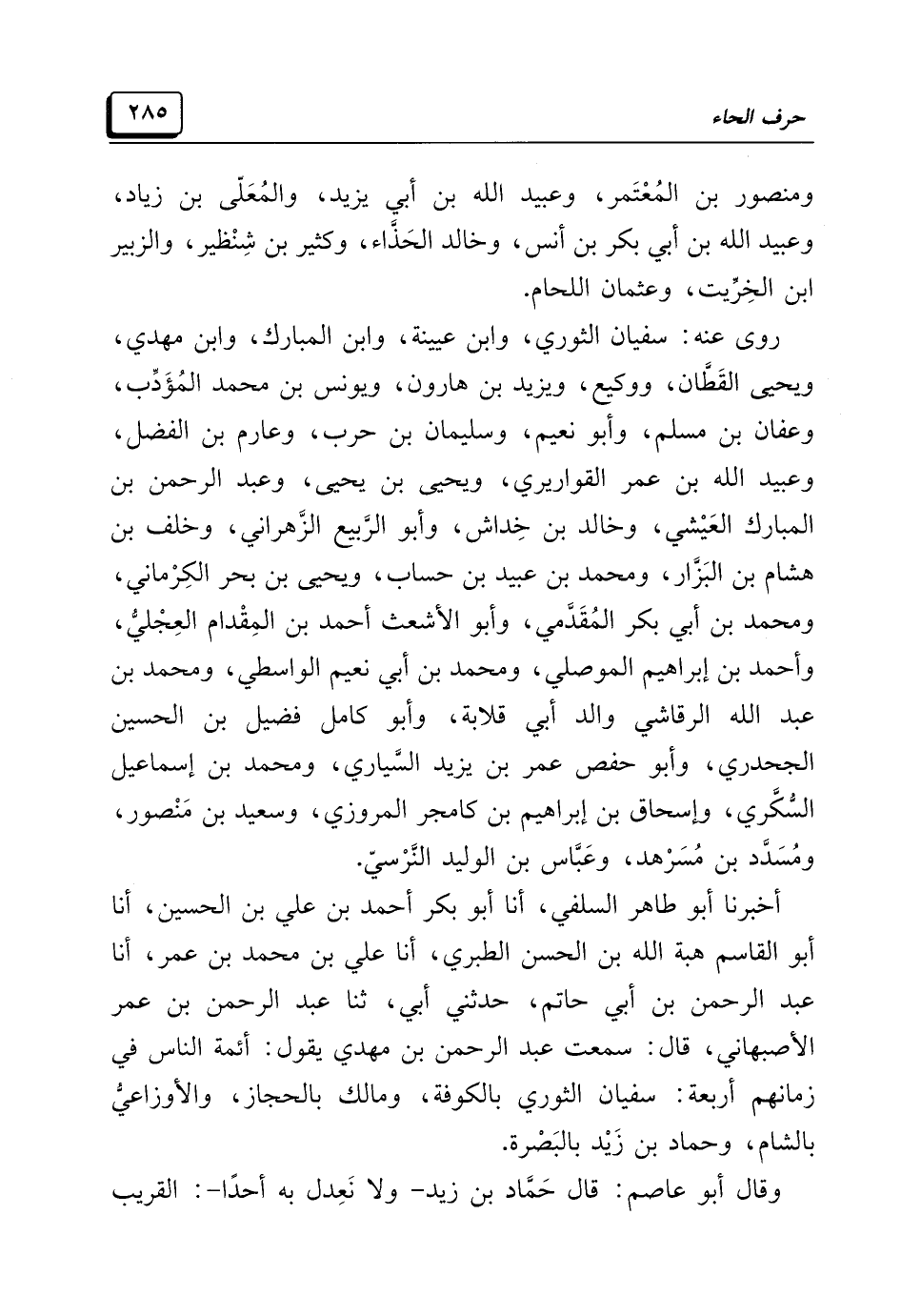 أخبرنا أبو طاهر السلفي، أنا أبو بكر أحمد بن علي بن الحسين، أنا أبو القاسم هبة الله بن الحسن الطبري، أنا علي بن محمد بن عمر، أنا عبد الرحمن بن أبي حاتم، حدثني أبي، ثنا عبد الرحمن بن عمر الأصبهاني، قال: سمعت عبد الرحمن بن مهدي يقول: أئمة الناس في زمانهم أربعة: سفيان الثوري بالكوفة، ومالك بالحجاز، والأوزاعيُّ بالشام، وحماد بن زَيْد بالبَصْرة.