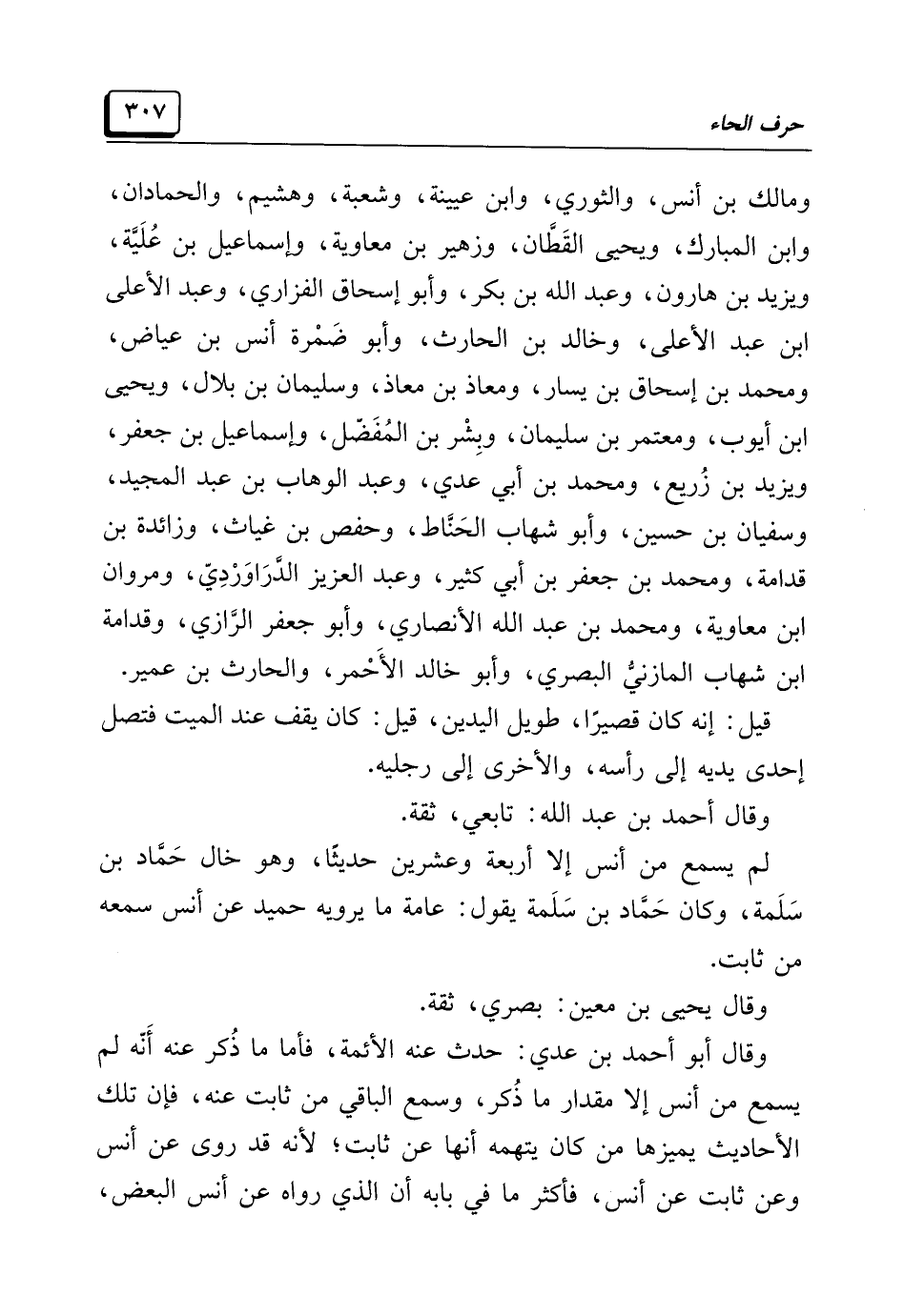 وقال أبو أحمد بن عدي: حَدَّثَ عنه الأئمة، فأما ما ذُكر عنه أنَّه لم يسمع من أنس إلَّا مقدار ما ذُكر، وسمع الباقي من ثابت عنه، فإنَّ تلك الأحاديث يميزها من كان يتهمه أنَّها عن ثابت؛ لأنَّه قد روى عن أنس وعن ثابت عن أنس، فأكثر ما في بابه أن الَّذي رواه عن أنس البعض،