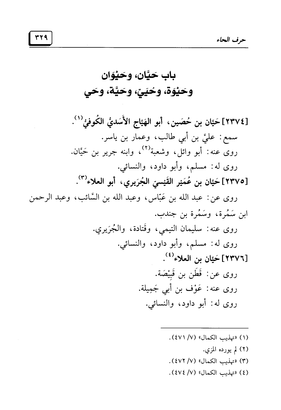 [٢٣٧٤] حَيَّان بن حُصَيْن، أبو الهَيَّاج الأَسَدِيُّ الكُوفِيُّ (¬١).