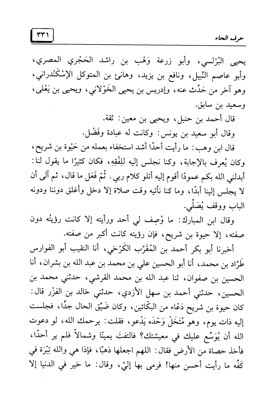 أخبرنا أبو بكر أحمد بن المُقَرَّب الكَرْخِي، أنا النقيب أبو الفوارس طَرَّاد بن محمد، أنا أبو الحسين عليّ بن محمد بن عبد الله بن بِشْران، أنا الحسين بن صفوان، ثنا عبد الله بن محمد القُرَشِي، حدَّثني محمد بن الحسين، حدَّثني أحمد بن سهل الأَزْدِيّ، حدَّثني خالد بن الفزْر قال: كان حيوة بن شريح دَعَّاء من البكّائين، وكان ضَيِّق الحال جدًّا، فجلست إليه ذات يوم، وهو مُتَخَلّ وَحْدَه يَدْعو، فقلت: يرحمك الله، لو دعوت الله أن يُوَسِّع عليك في معيشتك؟ فالتفت يمينًا وشمالًا فلم ير أحدًا، فأخذ حصاة من الأرض فقال: اللَّهُمَّ اجعلها ذهبًا، فإذا هي والله تِبْرَة في كَفِّه ما رأيت أحسن منها! فرمى بها إليَّ، وقال: ما خير في الدُّنْيَا إلَّا