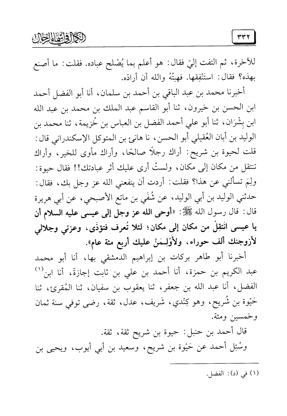أخبرنا محمد بن عبد الباقي بن أحمد بن سلمان، أنا أبو الفَضْل أحمد ابن الحسن بن خيرون، ثنا أبو القاسم عبد الملك بن محمد بن عبد الله ابن بِشْران، ثنا أبو عليّ أحمد الفَضْل بن العبَّاس بن خُزَيْمَة، ثنا محمد بن الوليد بن أَبَان العُقَيْلي أبو الحسن، نا هانئ بن المتوكِّل الإِسْكَنْدَرَاني قال: قلت لحيوة بن شريح: أراك رجلًا صالحًا، وأراك مأوى للخير، وأراك تنتقل من مكان إلى مكان، ولستُ أرى عليك أثر عبادتك! ! فقال حيوة: ولِمَ تسألني عن هذا؟ فقلت: أردت أن ينفعني الله عزَّ وجلَّ بك، فقال: حدَّثني الوليد بن أبي الوليد، عن شُفَي بن ماتع الأصبحي، عن أبي هريرة قال: قال رسول الله -صَلَّى اللهُ عَلَيْهِ وَسَلَّمَ-: "أوحى الله عزَّ وجلَّ إلى عيسى عليه السلام أن يا عيسي انتَقِلْ من مكان إلى مكان؛ لئلا تُعرف فتؤذَى، وعزتي وجلالي لأزوجنك ألف حوراء، ولأَوْلِمَنَّ عليك أربع مئة عام".