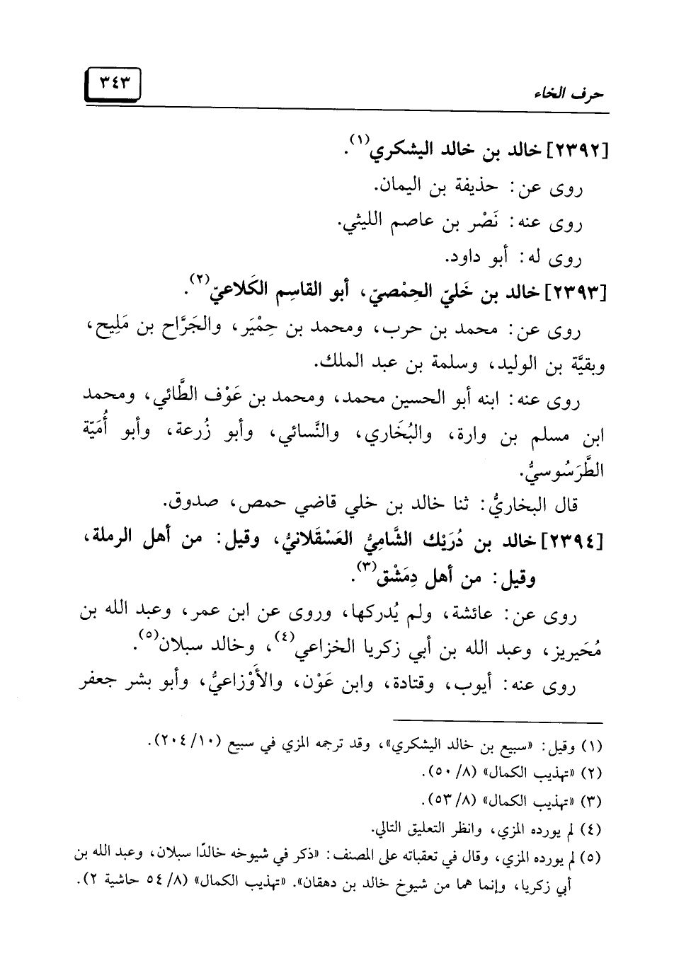 (¬٥) لم يورده المزي، وقال في تعقباته على المصنِّف: "ذكر في شيوخه خالدًا سبلان، وعبد الله بن أبي زكريا، وإنَّما هما من شيوخ خَالد بن دهقان". "تهذيب الكمال" (٨/ ٥٤ حاشية ٢).