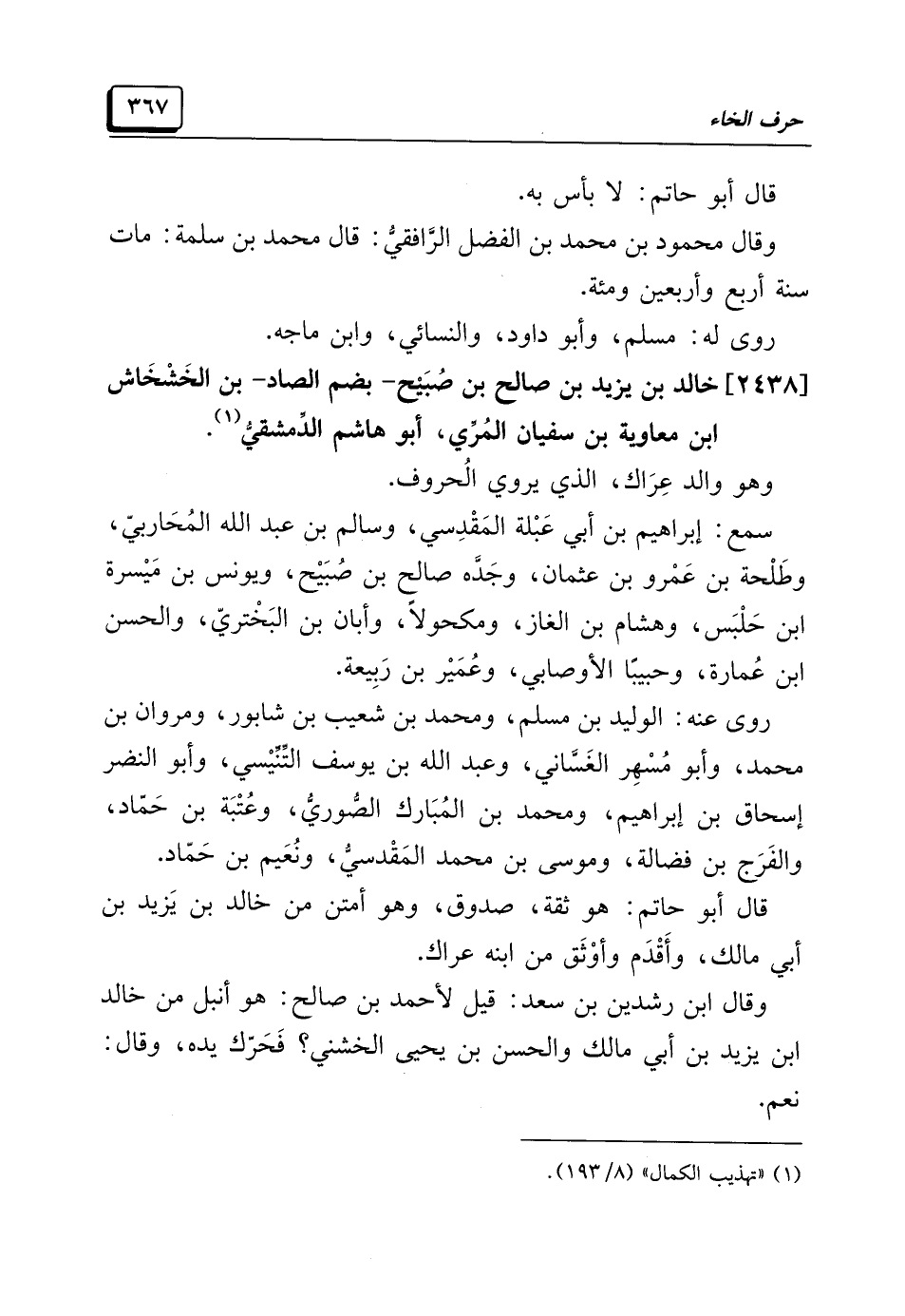 [٢٤٣٨] خالد بن يزيد بن صالح بن صُبَيْح -بضم الصاد- بن الخَشْخَاش ابن معاوية بن سفيان المُرِّي، أبو هاشم الدِّمَشْقِيُّ (¬١).
