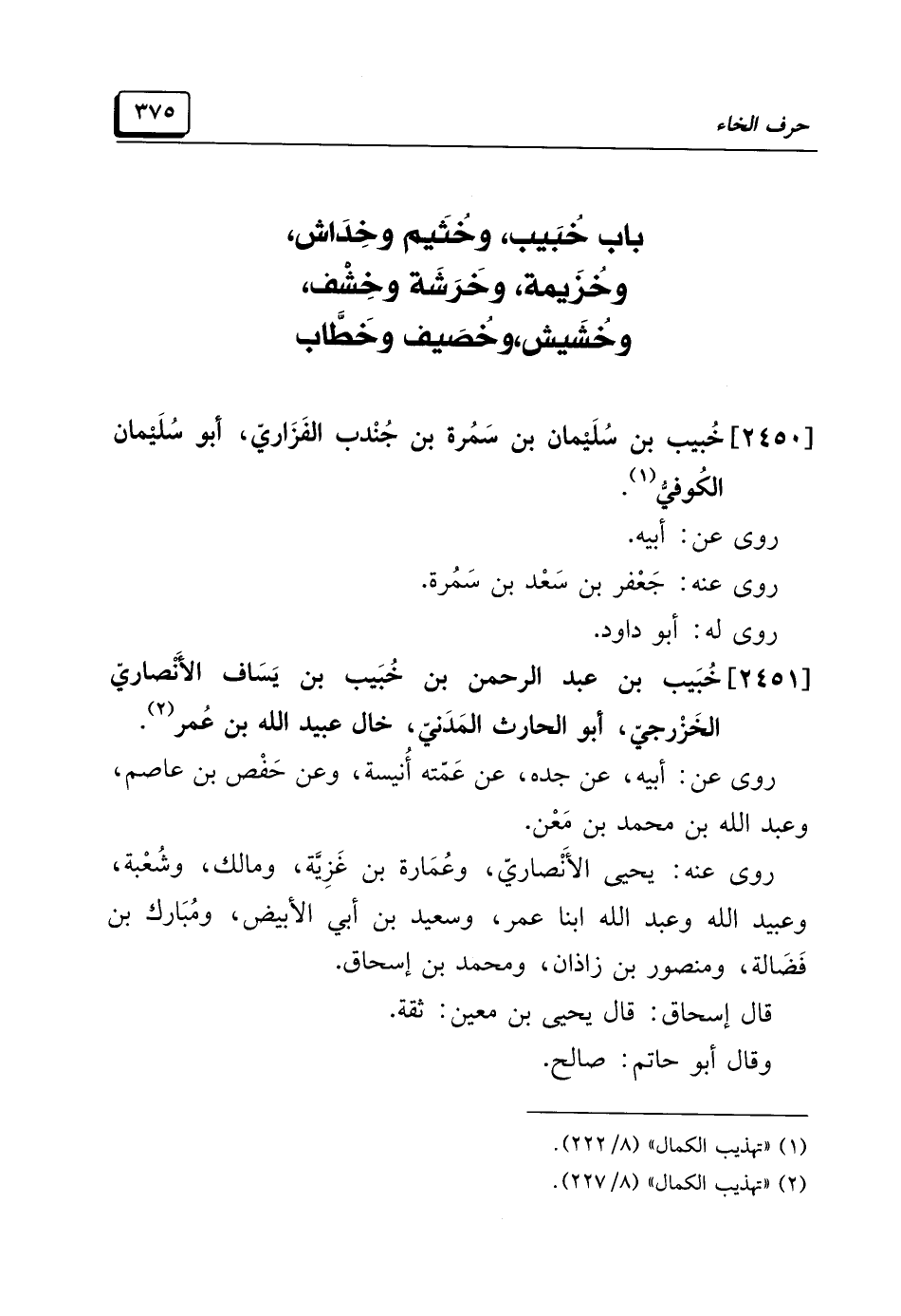 باب خُبَيب، وخُثَيم وخِدَاش، وخُزَيْمَة، وخَرَشَة وخِشْف، وخُشَيش، وخُصَيف وخَطَّاب
