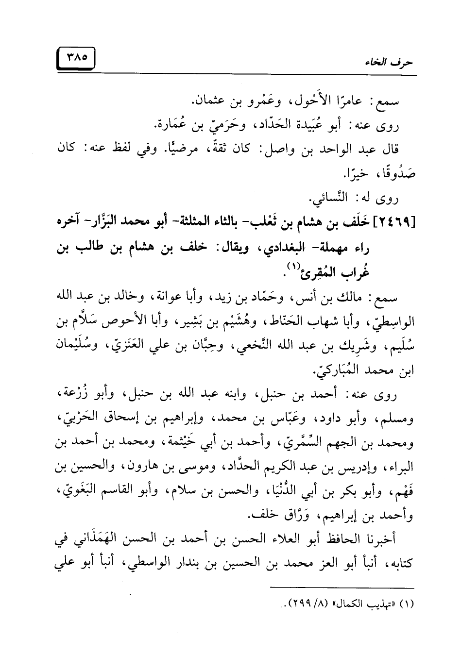 [٢٤٦٩] خَلَف بن هشام بن ثَعْلب -بالثاء المثلثة- أبو محمد البَزَّار -آخره راء مهملة- البَغْدَادِيّ، ويقال: خَلَف بن هشام بن طالب بن غُراب المُقِرئ (¬١).