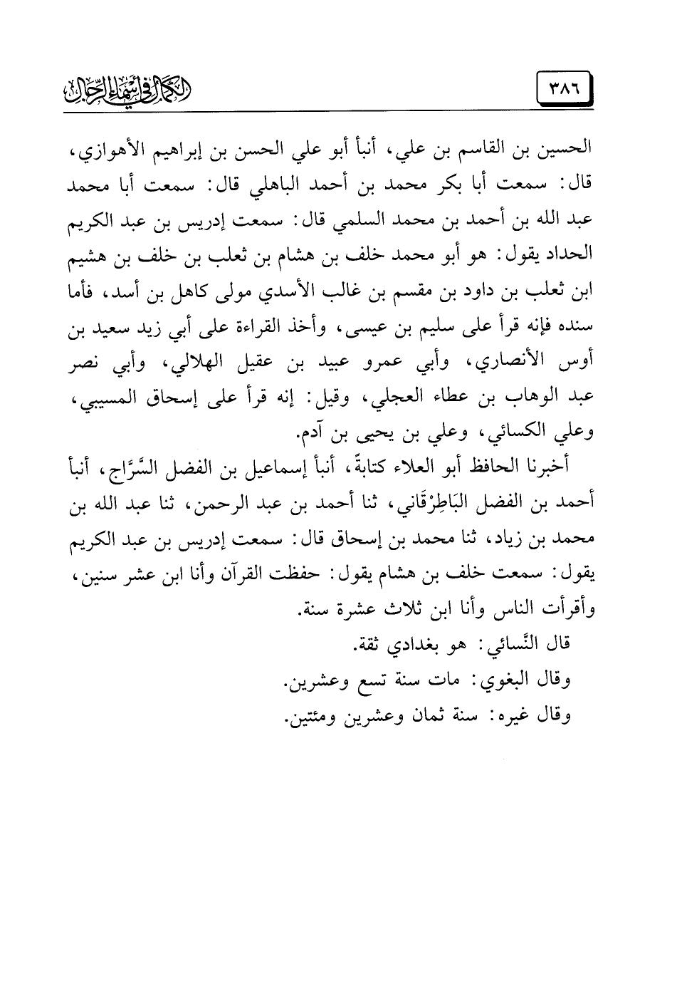 الحسين بن القاسم بن عليّ، أنبأ أبو عليّ الحسن بن إبراهيم الأَهْوَازِيَّ، قال: سمعت أبا بكر محمد بن أحمد البَاهِلِي قال: سمعت أبا محمد عبد الله بن أحمد بن محمد السُّلَمي قال: سمعت إدريس بن عبد الكريم الحداد يقول: هو أبو محمد خَلَف بن هشام بن ثعلب بن خَلَف بن هُشَيْم ابن ثعلب بن داود بن مقسم بن غالب الأَسدِي مولي كاهل بن أسد، فأما سنده فإنَّه قرأ على سليم بن عيسى، وأخذ القراءة على أبي زيد سعيد بن أوس الأَنْصَاريّ، وأبي عَمْرو عبيد بن عَقِيل الهلالي، وأبي نصر عبد الوَهَّاب بن عطاء العِجْلِي، وقيل: إنَّه قرأ على إسحاق المسيبي، وعلي الكِسَائي، وعلي بن يحيى بن آدم.