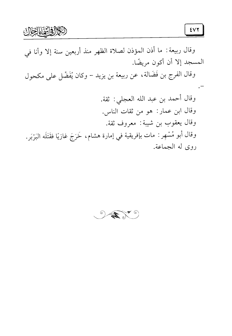 وقال ربيعة: ما أذن المؤذن لصلاة الظهر منذ أربعين سنة إلا وأنا في المسجد إلا أن أكون مريضًا.