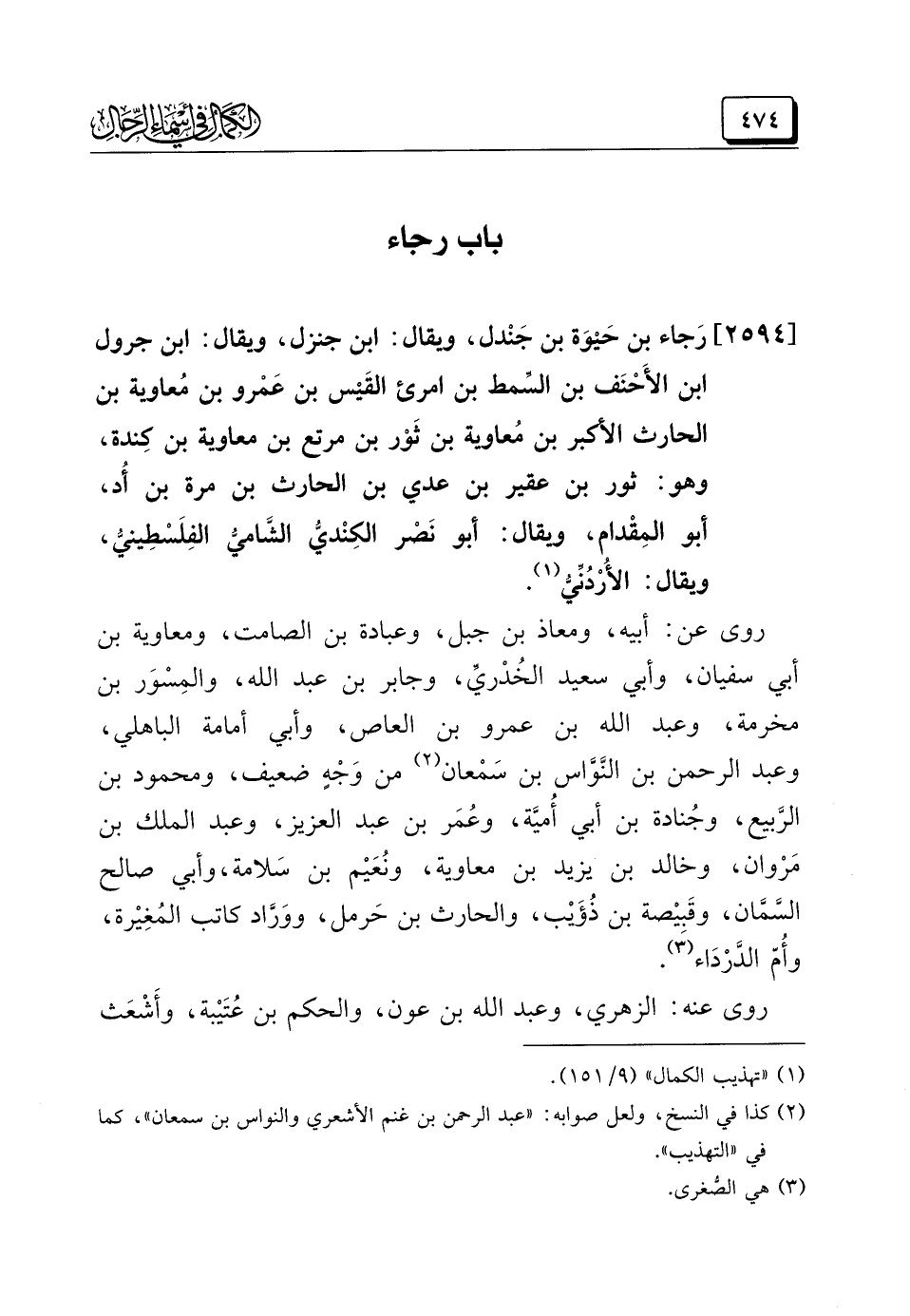 [٢٥٩٤] رَجاء بن حَيْوَة بن جَنْدل، ويقال: ابن جنزل، ويقال: ابن جرول ابن الأَحْنَف بن السِّمط بن امرئ القَيْس بن عَمْرو بن مُعاوية بن الحارث الأكبر بن مُعاوية بن ثَوْر بن مرتع بن معاوية بن كِندة، وهو: ثور بن عقير بن عدي بن الحارث بن مرة بن أُد، أبو المِقْدام، ويقال: أبو نَصْر الكِنْديُّ الشَّاميُّ الفِلَسْطِينيُّ، ويقال: الأُرْدُنِّيُّ (¬١).