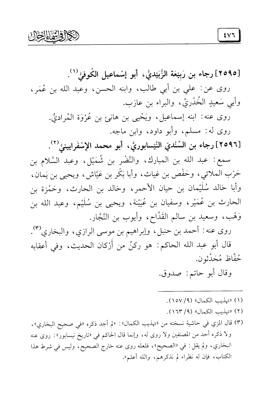 (¬٣) قال المزي في حاشية نسخته من "تهذيب الكمال": "لم أجد ذكره في صحيح البخاري"، ولا ذكره أحد من المصنفين ولا روي له، وإنما قال الحاكم في "تاريخ نيسابور": روى عنه البخاري، ولم يقل: في "الصحيح". فلعله روى عنه خارج الصحيح، وليس في شرط هذا الكتاب، فإن له نظراء لم نذكرهم، والله أعلم".