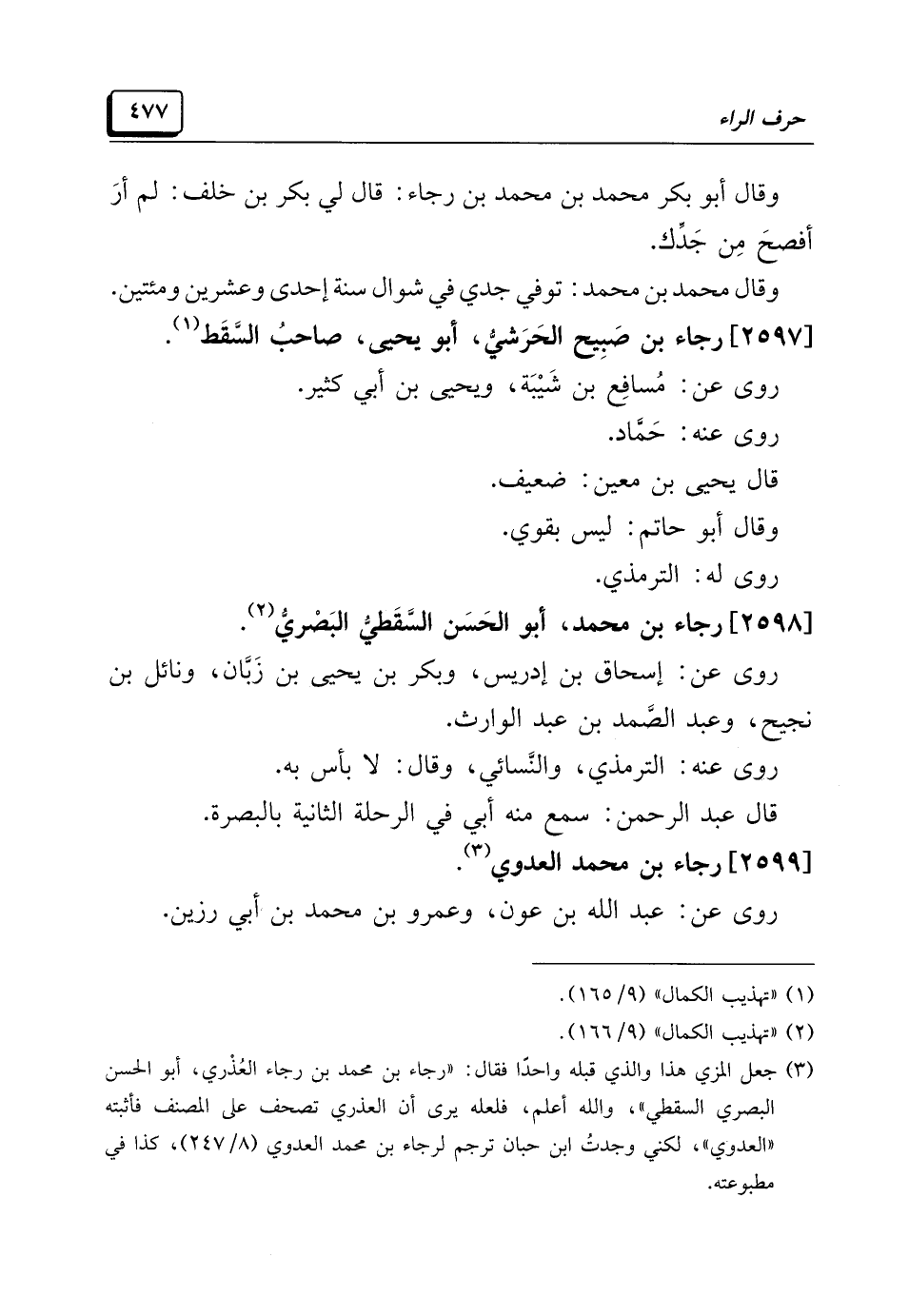 (¬٣) جعل المزي هذا والذي قبله واحدًا فقال: رجاء بن محمد بن رجاء العُذْري. أبو الحسن البصري السقطي"، والله أعلم، فلعله يرى أن العذري تصحف على المصنف فأثبته "العدوي". لكني وجدتُ ابن حبان ترجم رجاء بن محمد العدوي (٨/ ٢٤٧)، كذا في مطبوعته.
