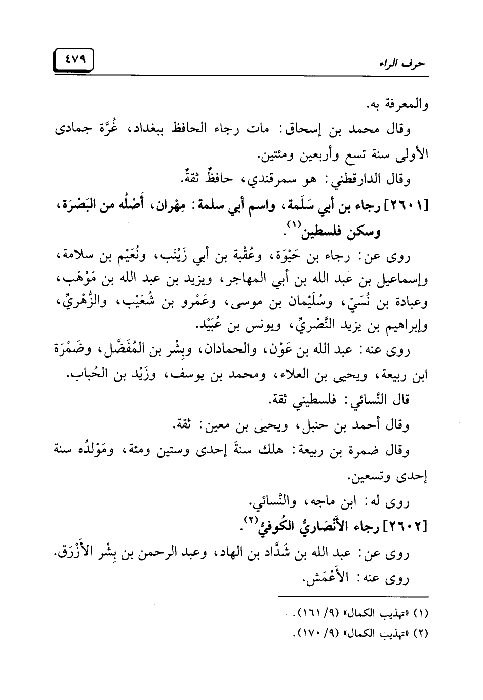 [٢٦٠١] رجاء بن أبي سَلَمة، واسم أبي سلمة: مِهْران، أَصْلُه من البَصْرَة، وسكن فلسطين (¬١).