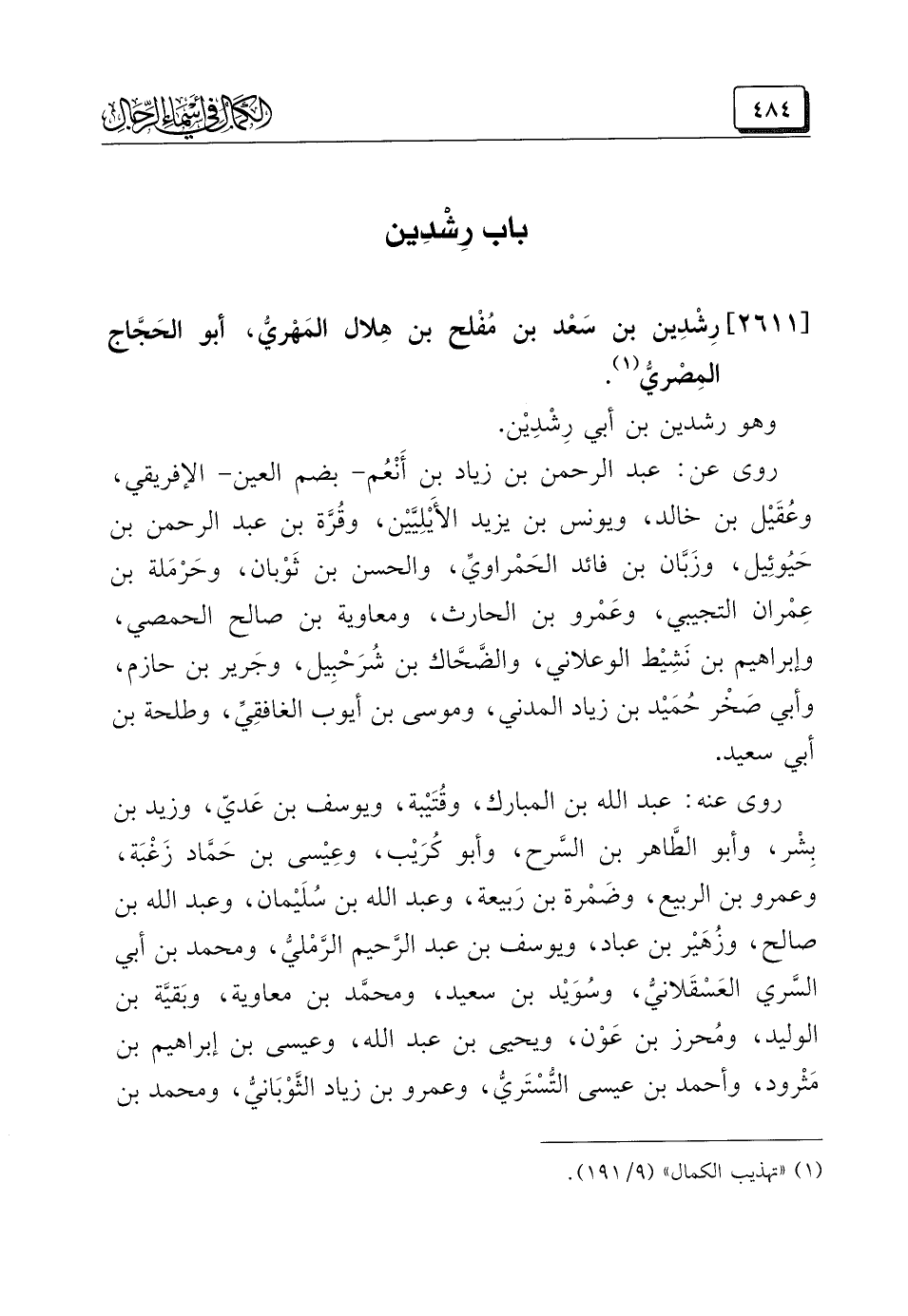 [٢٦١١] رِشْدِين بن سَعْد بن مُفْلح بن هِلال المَهْريُّ، أبو الحَجَّاج المِصْريُّ (¬١).